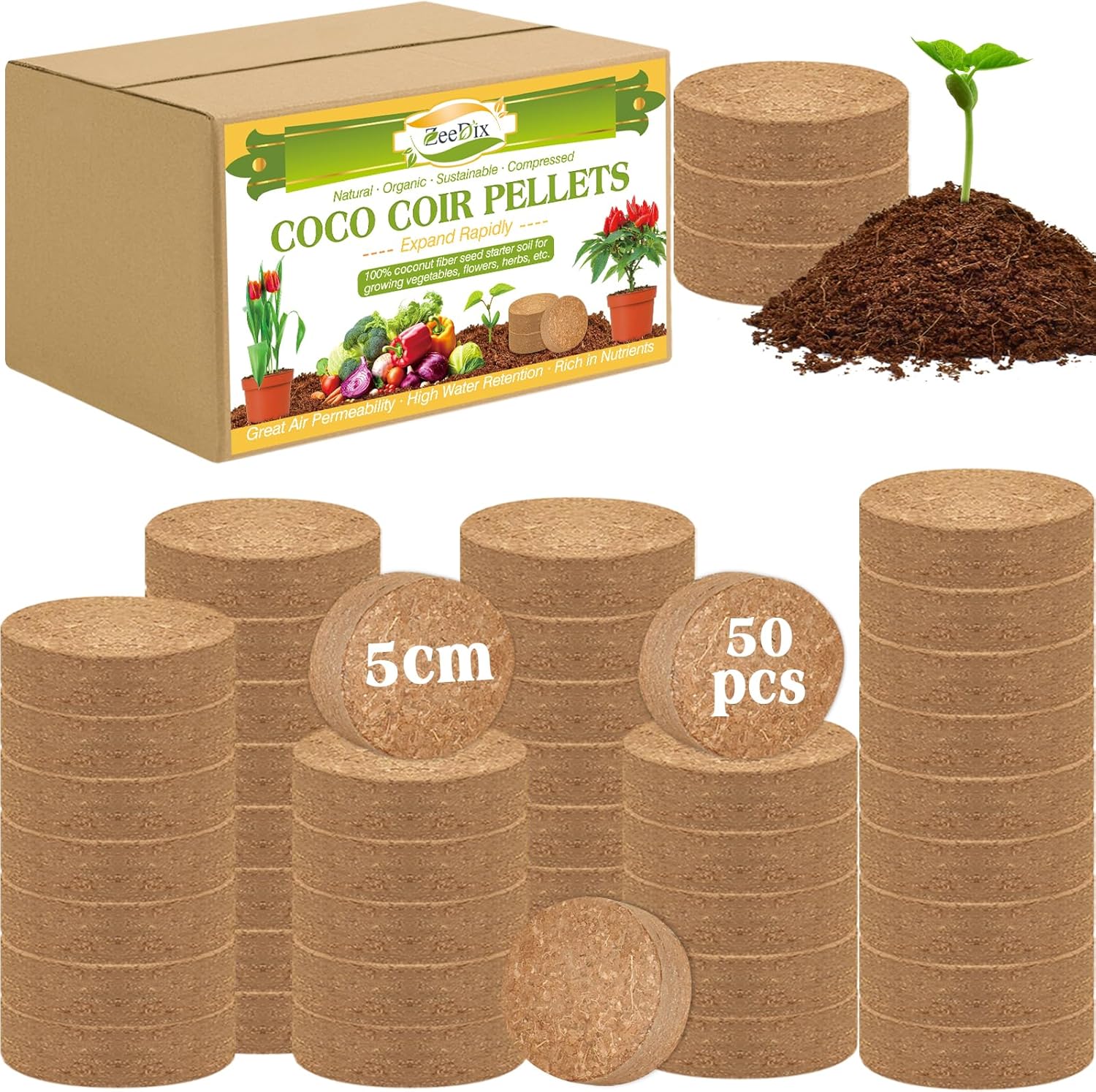 ZeeDix 50pcs 50mm Coco Coir Pellets, Compressed Soil Pellets Coconut Coir Seed Starter Discs Seed Starting Pellets Discs Potting Soil for Outdoor Plants Flowers Bonsai Herbs and Vegetables