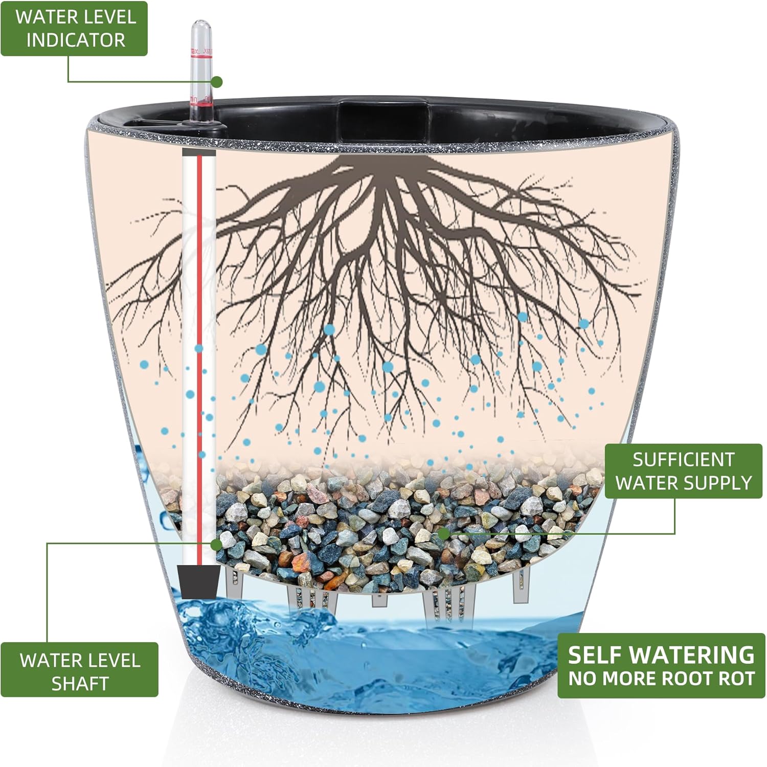 - NEVER MISS WATERING AGAIN - The hydroponic device keeps water ready, then watering time is at your discretion on the gauge. The design of drainage plug and spillway hole is to avoid cycles of overwatering and underwatering, pull out the plug to drain the excess water on rainy days outdoors. The sufficient water supply system enables double the water-efficient than conventional pots. Don't be anxious about missing watering while you enjoy a long term holiday on a journey or travel outside