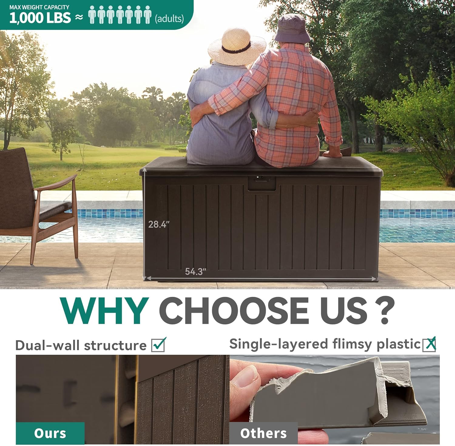 - Large 150-Gallon Capacity: The patio storage box measures 54.3"L x 27.2"W x 28.4"H, spacious enough to store various items such as cushions, tools, supplies