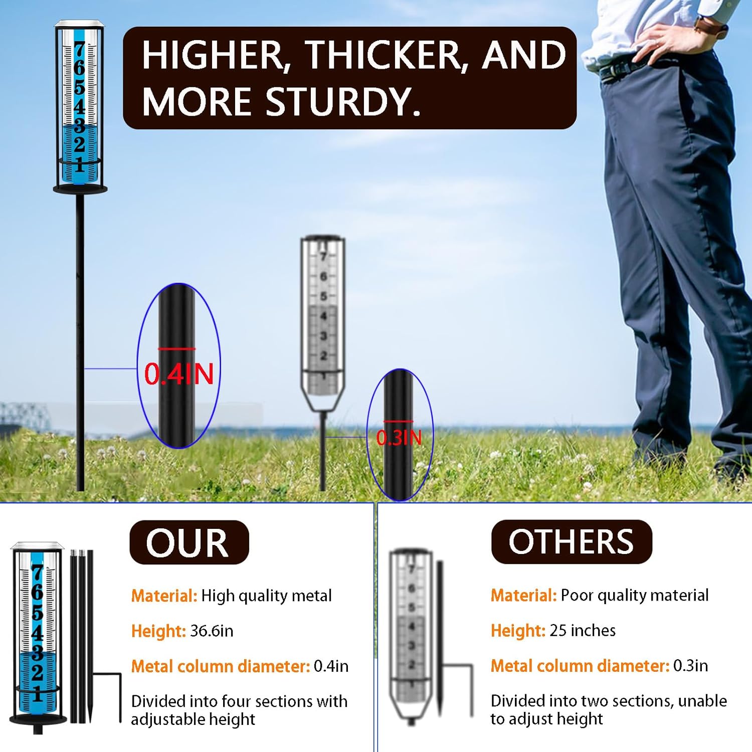 - 【4-Sections Adjustable Height】This large rain gauge outdoors best rated upgrade adopts a four-section design, and the overall height reaches 37 inches; You can also remove the middle section and adjust it to a height of 18 inches or 27 inches to meet your different needs. The height of 37inch is higher than other glass rain gauges on the market, so it is not easy to be covered by flowers and grass, and there is no need to squat down to read.