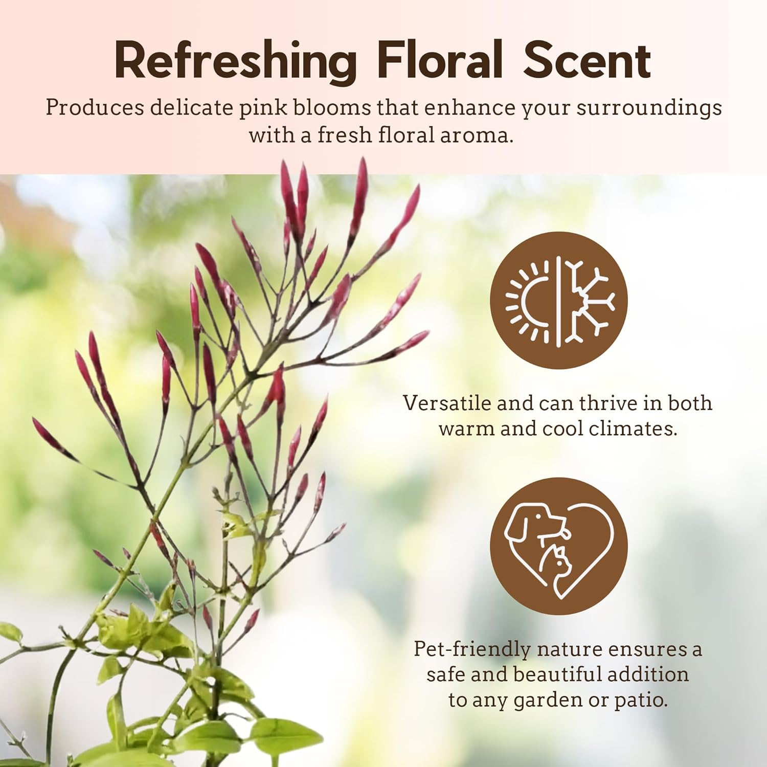 - Enchanting Fragrance: Experience the delightful, sweet aroma of the pink blooms on our Jasminum polyanthum live plant, which will fill your space with a refreshing floral scent each spring. Enhance the ambiance of any garden with our jasmine plant.