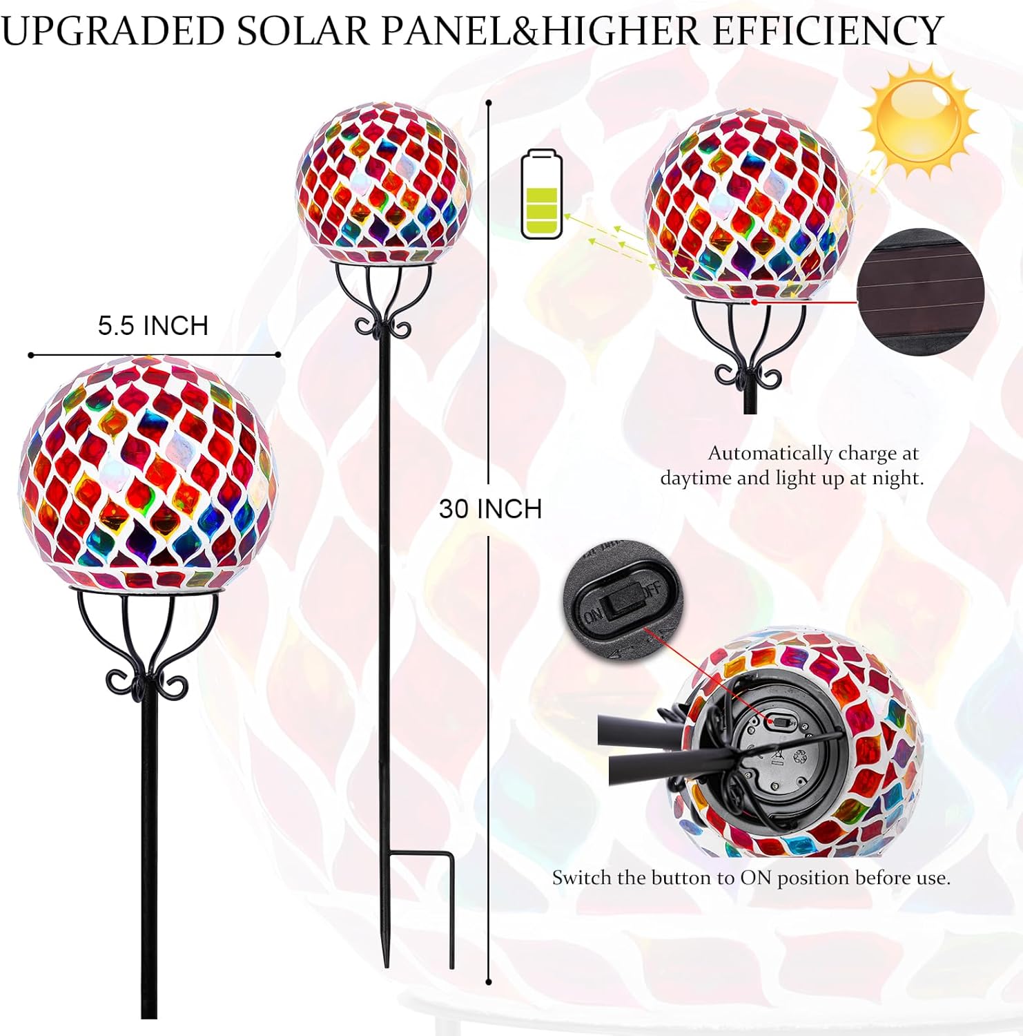 - Unique Design: Solar garden light is designed with mosaic glass globe ball, which lights up beautifully and looks fabulous! Garden lights enough to create a romantic atmosphere for you and attract your neighbor's eye to your yard
