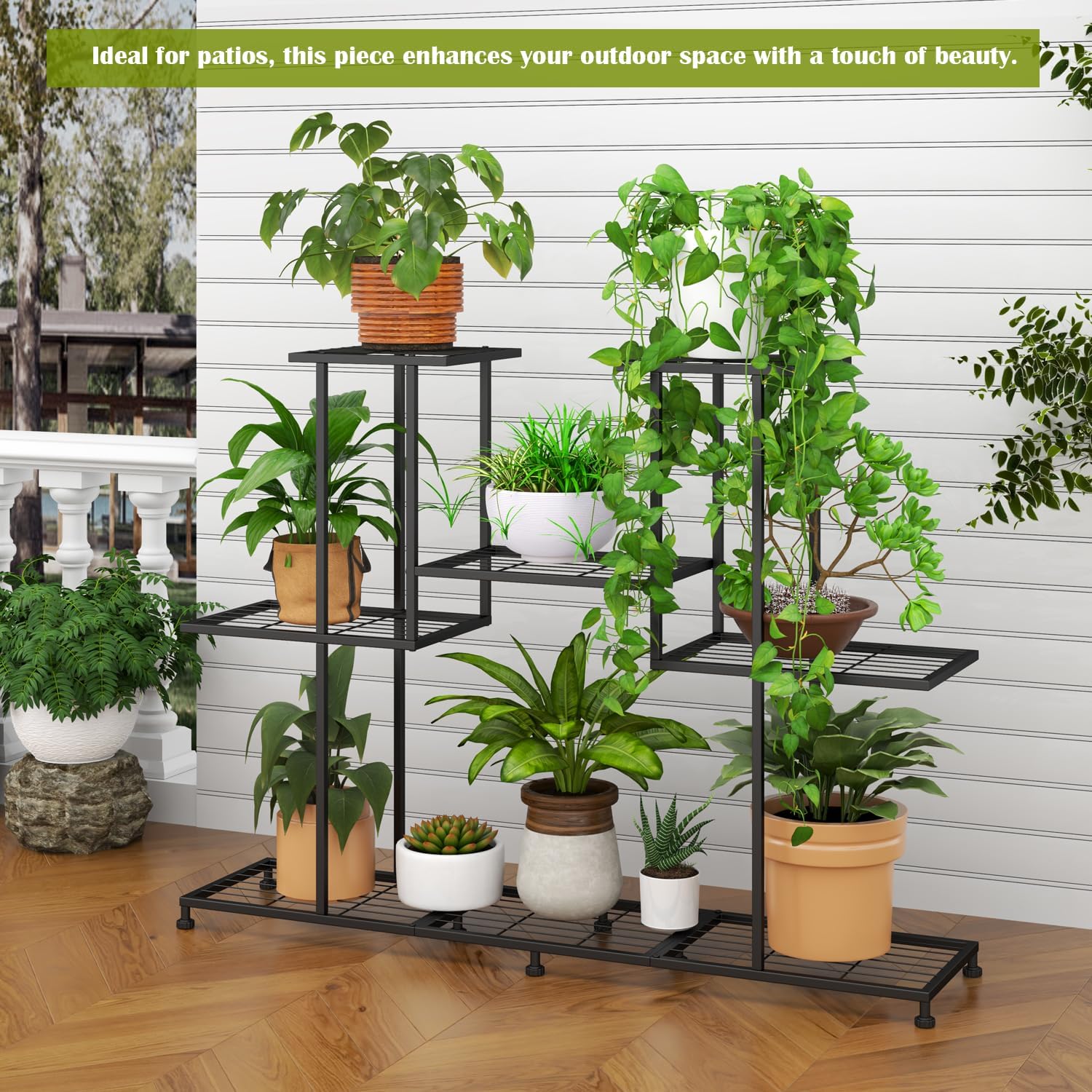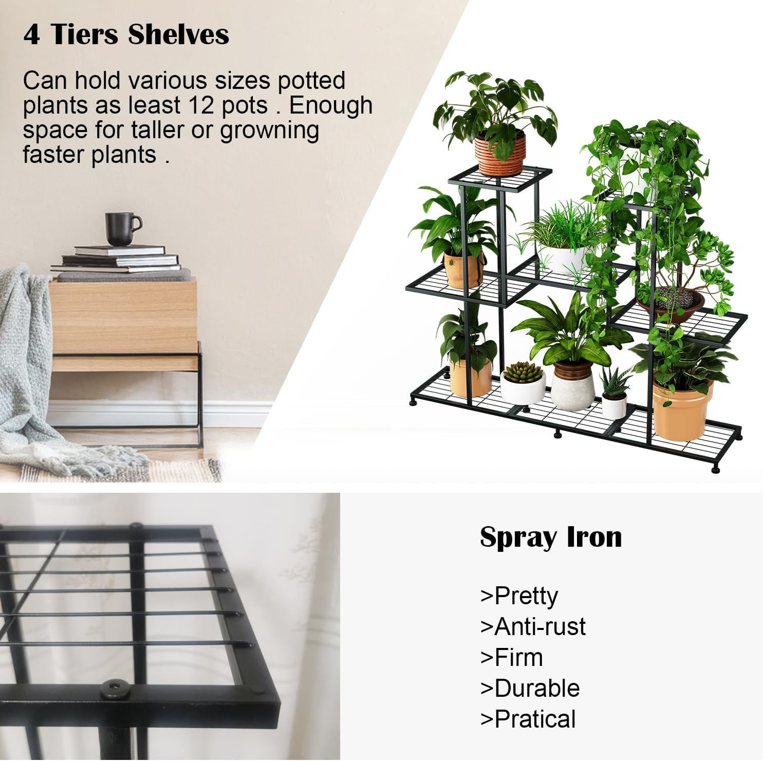 Metal Plant Stand, 5 Tiers Multifunctional Plant Stands for Indoor Plants, Decorative Black Steel Plant Shelf for Indoor Patio Garden Balcony and Yard (4 tiers 12 pots)