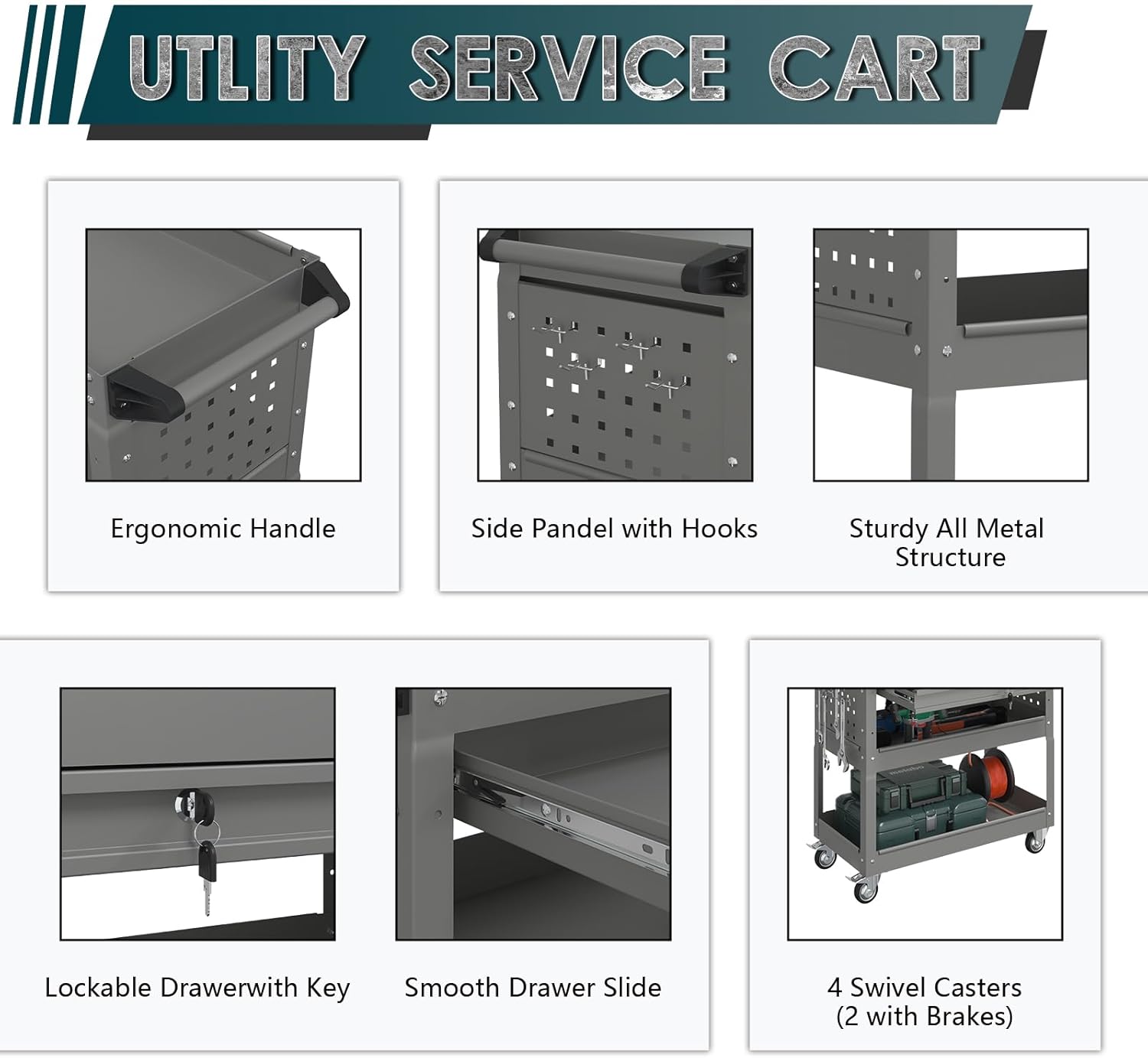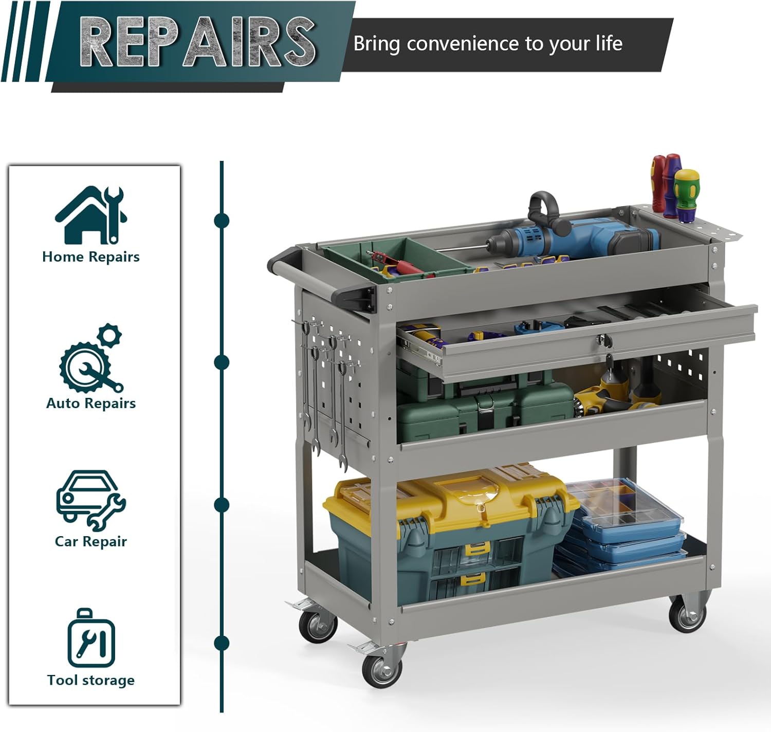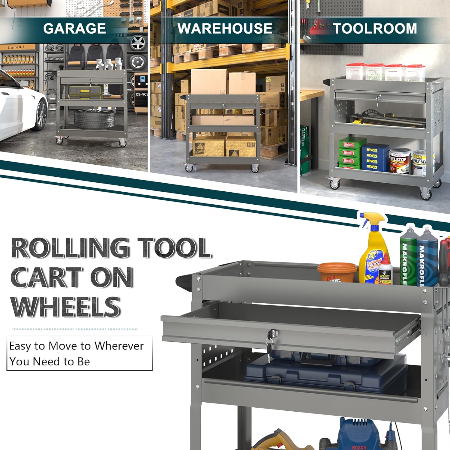 3 Tier Rolling Tool Cart on Wheels with Locking Drawer - Metal Service Cart Industrial Utility Cart for Mechanic - 350 LBS Mobile Storage Organizer for Garage, (Gray)