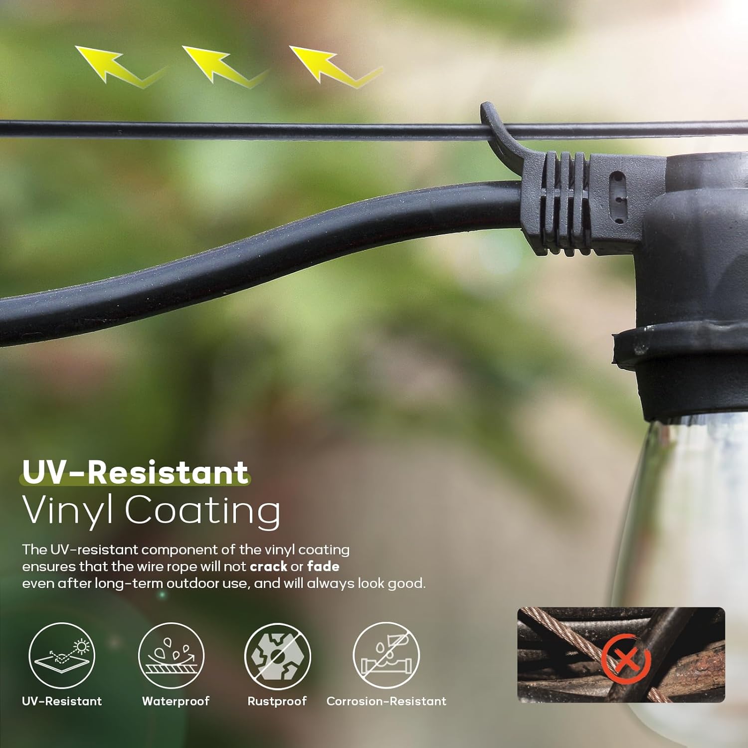 - UV Resistant Steel Wire Rope: The T304 wire rope is coated with vinyl through an injection molding process, making it smooth and gentle on your hands. It boasts excellent waterproof, rust, and corrosion resistance. The added UV-resistant ingredient ensures the cable won't crack or fade, even after prolonged outdoor use, keeping your beautifully decorated garden looking fresh