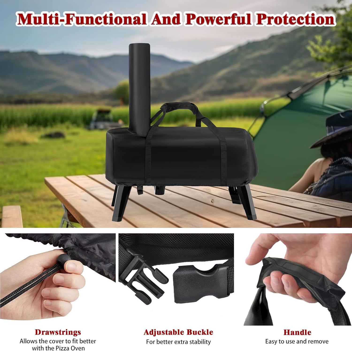 - Upgraded Design: With adjustable buckle on the bottom of the pizza oven, you can flexibly adjust the elasticity of the cover to prevent it from being blown away by the wind, our pizza oven cover/tote bag is designed with padded handles, convenient for you to carry the pizza oven to camping, the elastic band can provide stable protection on windy days.