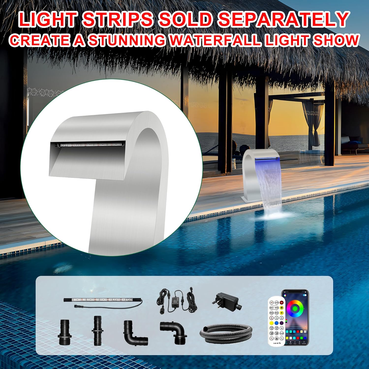 - One Year Replacement Committment: This elegant pool fountian requires a separately obtained pump for operation. We stand behind our products, and our dedicated support team is available to address inquiries regarding this product, offering prompt responses within a day. Please browse our other products for pool fountain accessories in our store. Waterfall only. LED light strips additional purchase.