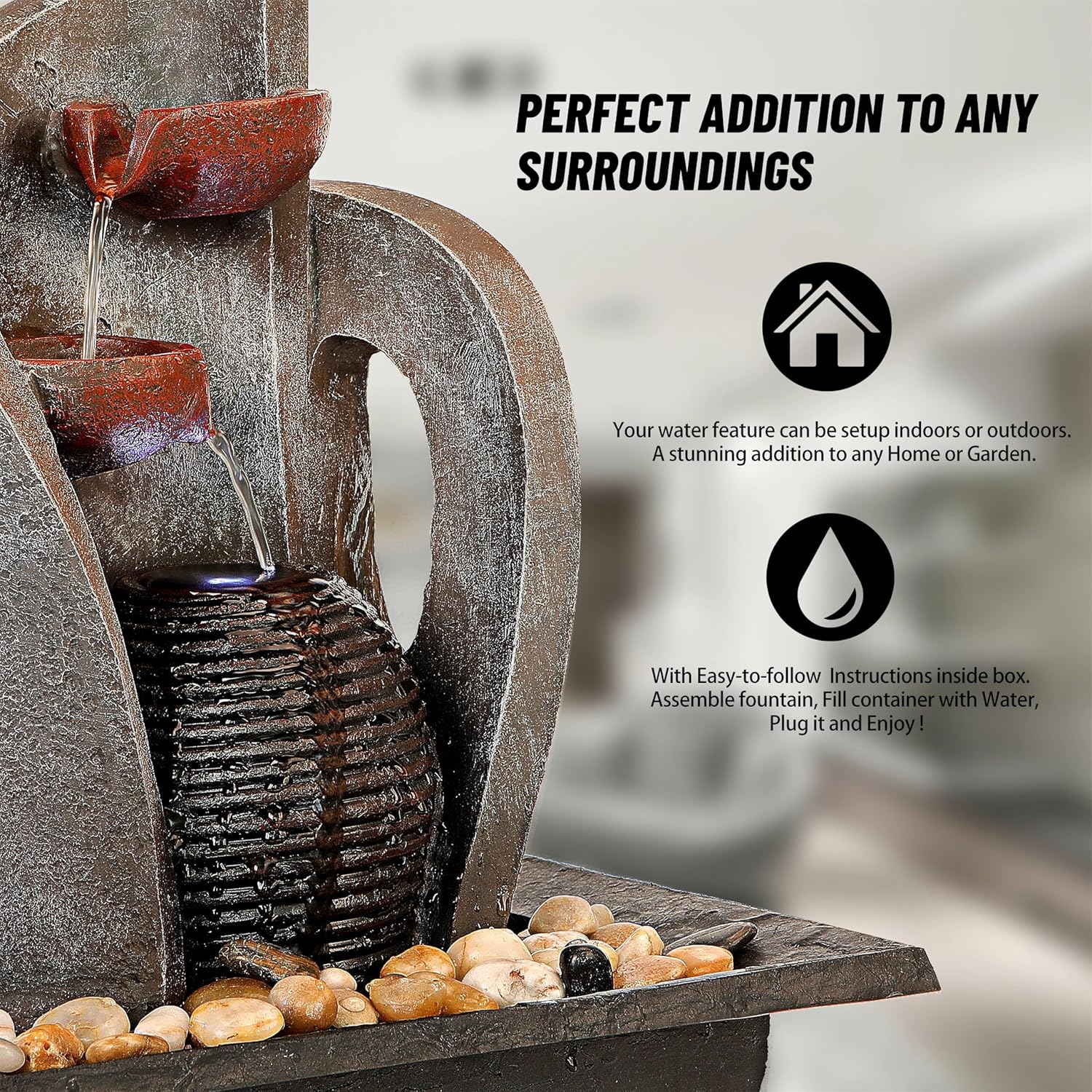 - Transform your outdoor space with our captivating outdoor water fountain. Designed for durability, it adds charm to gardens and patios with the landscape enhanced by potted LED lighting as an elegant focal point. Enjoy the soothing sounds of nature while unwinding outdoors