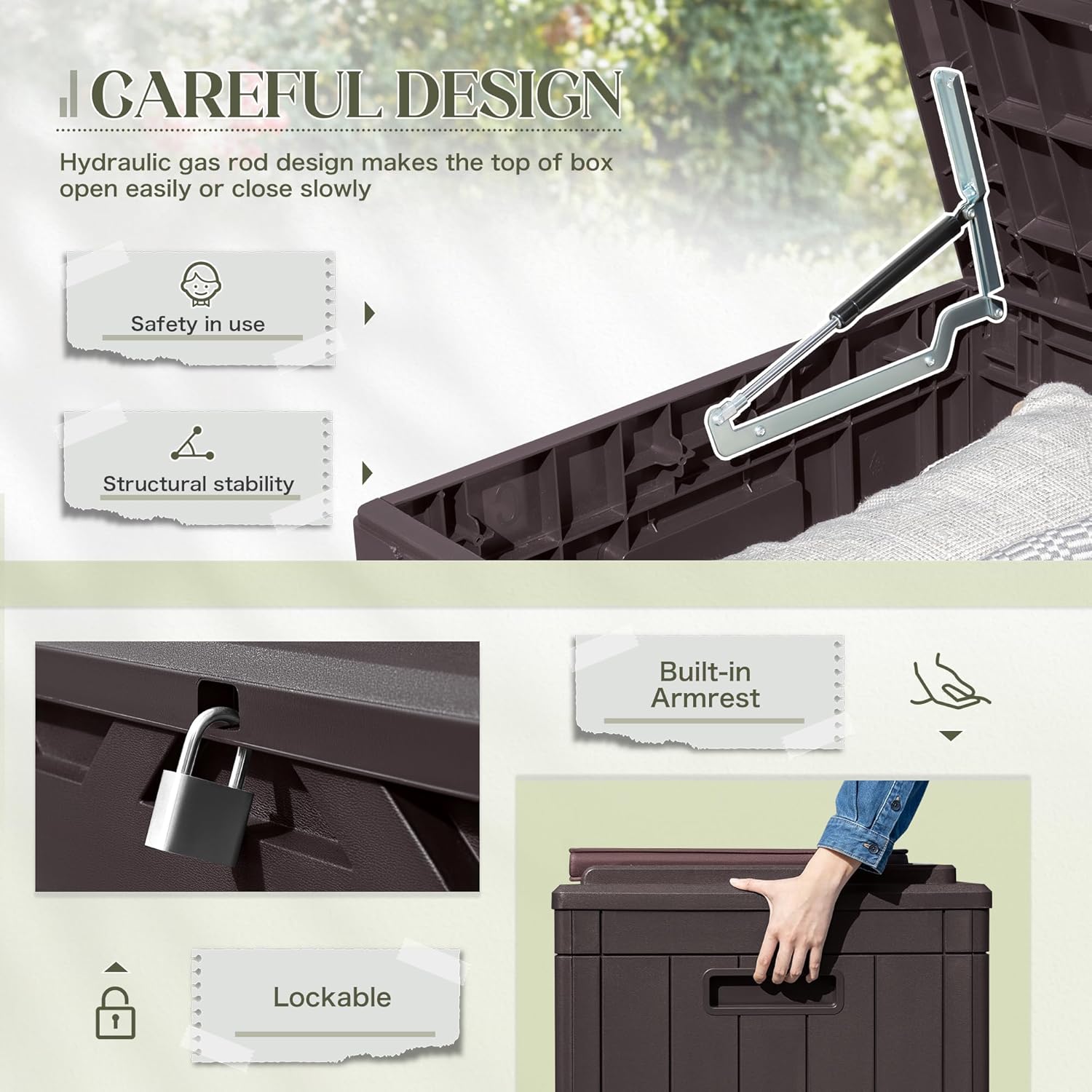 - PRACTICAL DESIGN: The deck box has a hydraulic holder design, which can prevent your hand from being caught when you open and close the box to ensure safety. Meanwhile, there is a support bar designed inside the lid, which can enhance the durability of the storage box.