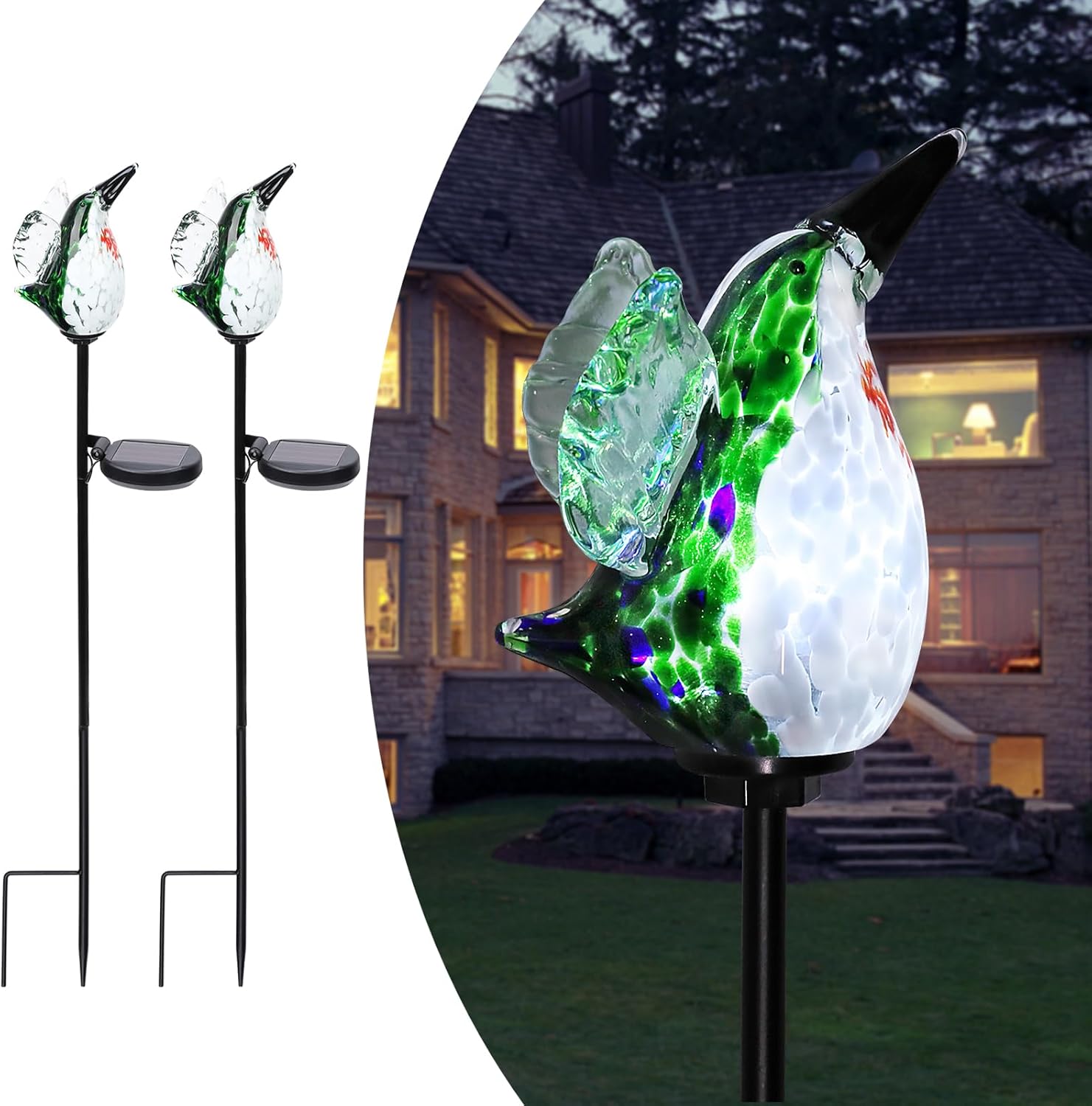 Afirst Solar Hummingbird Garden Stake Lights Hand Blown Glass Decorative Garden Pathway Lights Outdoor Waterproof Bird Glass Stakes 2 Pack