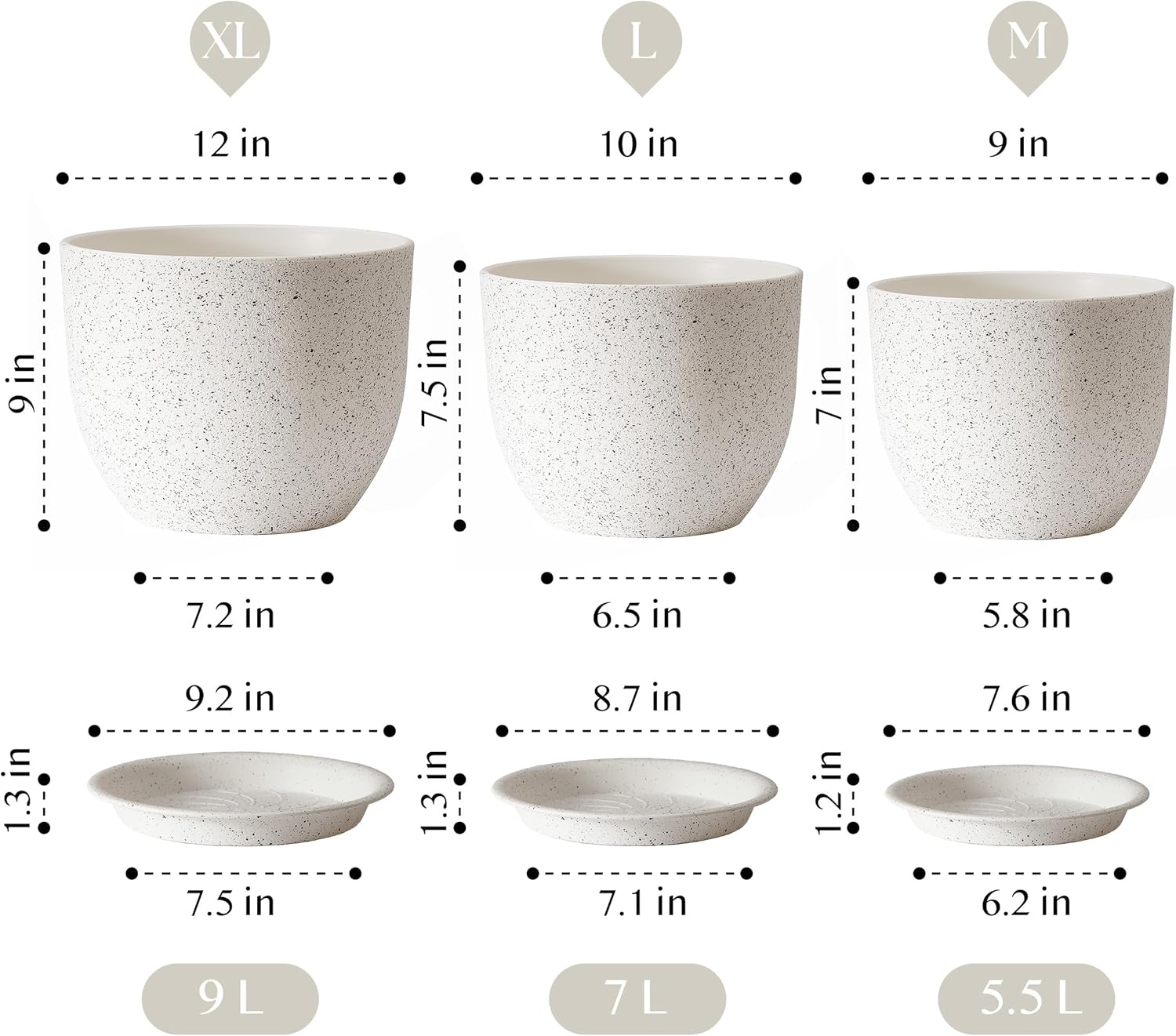 Giraffe Creation 12/10/9 Set of 3 Speckled White Plant Pots, Modern Indoor & Outdoor Planters with Drainage Holes and Saucers