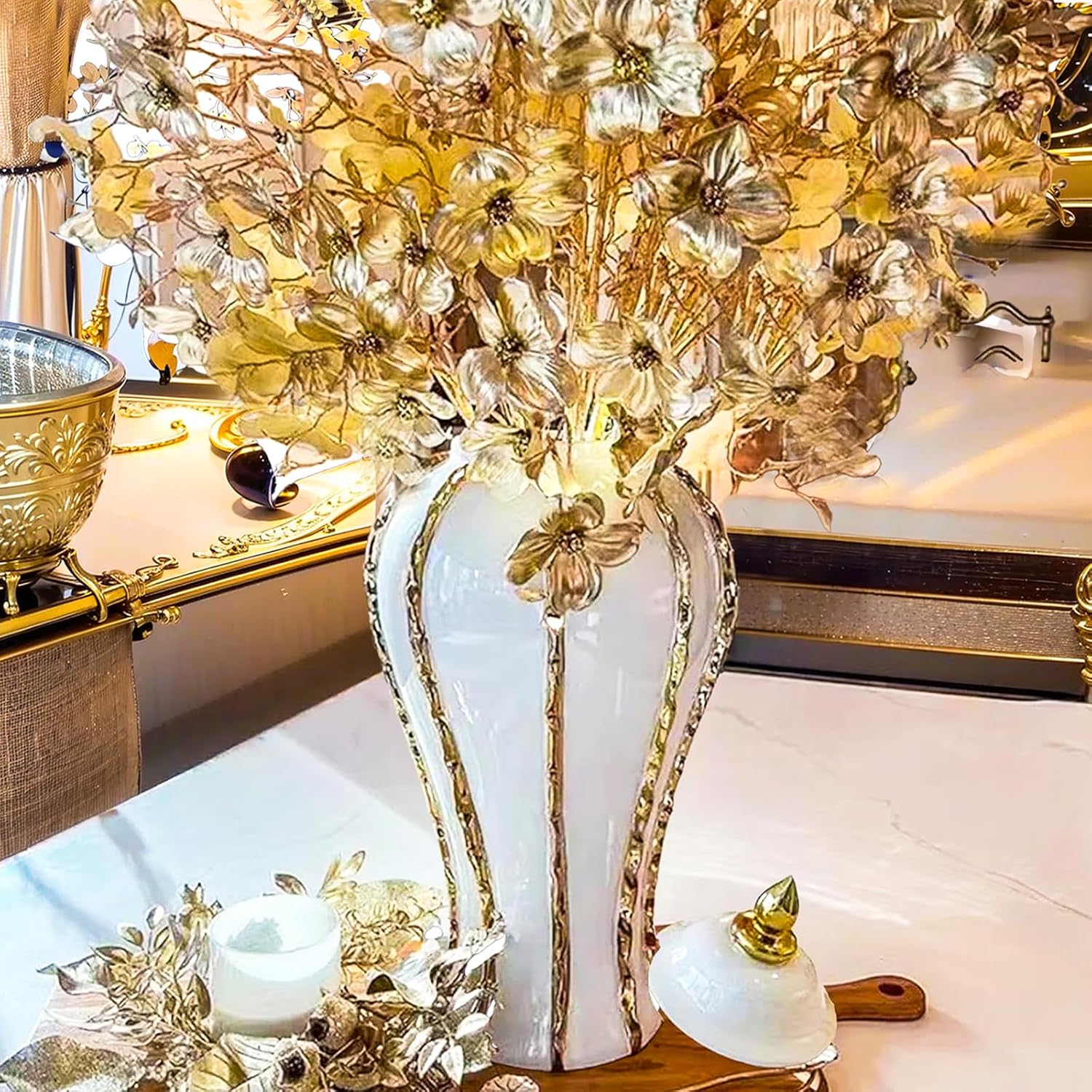 Ginger Jar, White Gold Ceramic Vase Large Handmade Porcelain Vases with Lid, White Gold Decorative Flower Vase for Home, Living Room, Weddings, Centerpieces (18in with Lid)