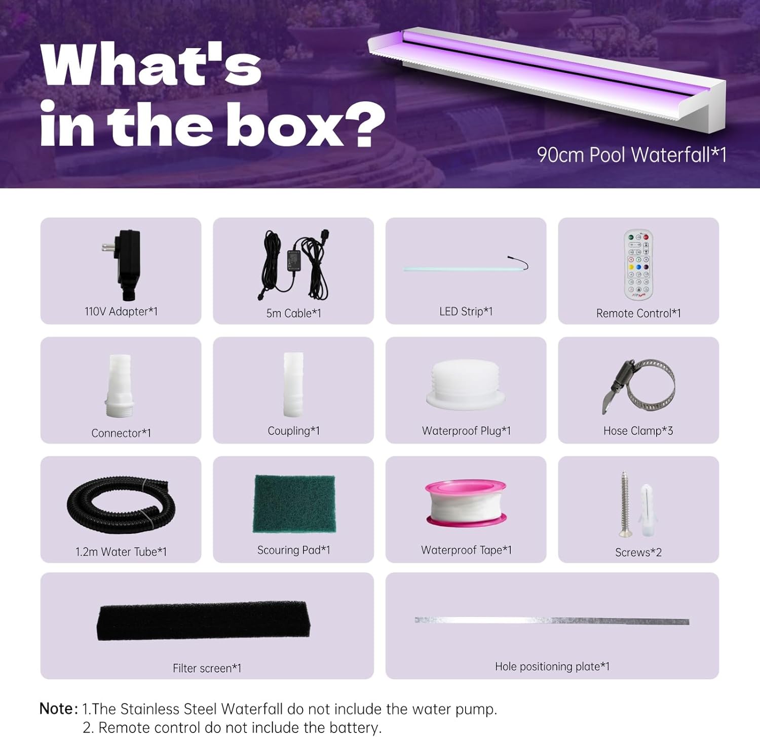 - 【Decoration Waterfall】Weejian waterfall spillway will make a decorative addition to your garden patio pond or swimming pool, it makes them more elegant, fashionable and beautiful. The color change of LED lights and the gentle sound of water running make your patio more special at night.
