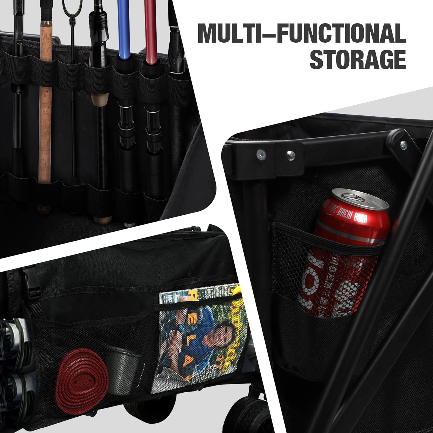 - Extendable & Rod Holder: The fishing wagon has a tailgate, which can be used as an extension to hold longer items. The practical design of fishing rod fixing webbing and side pockets can better store 6 fishing rods and other items. It is very suitable for people who love fishing.