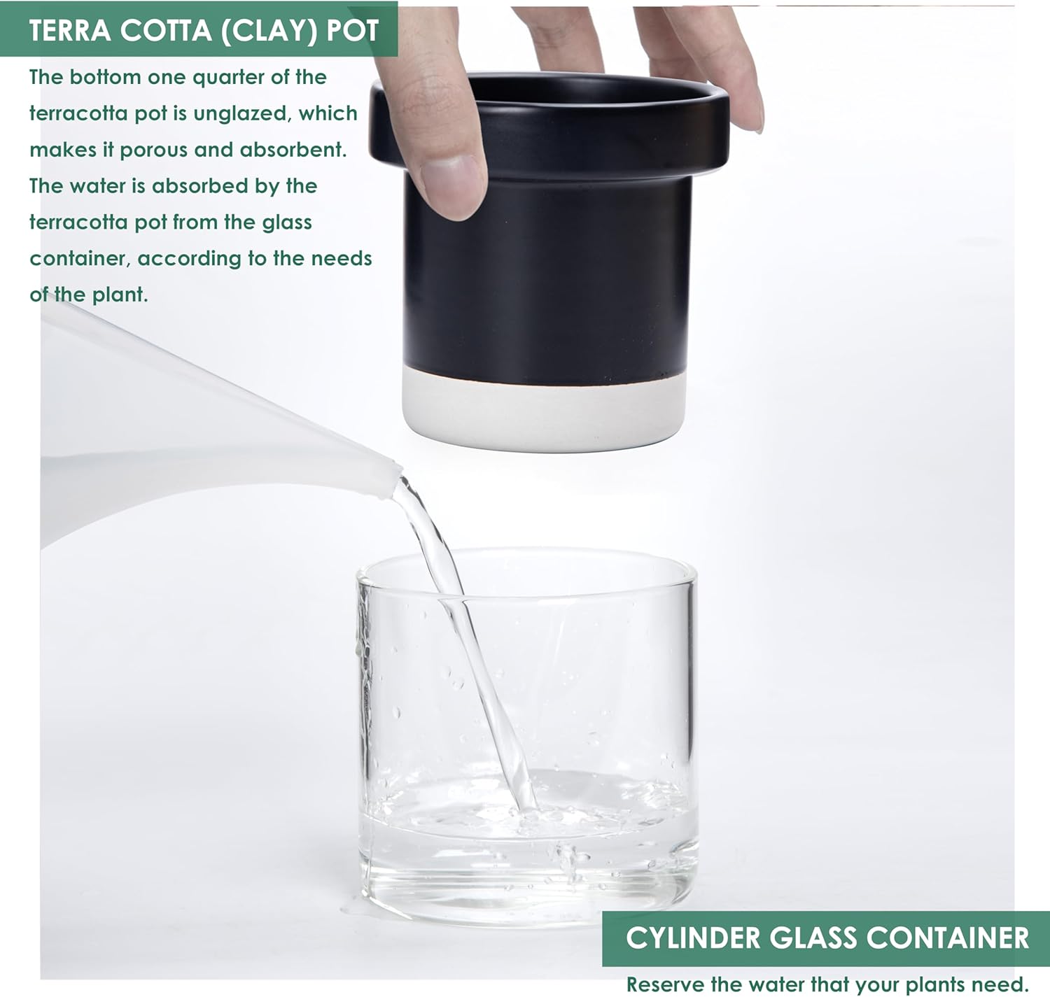- Self-Watering System: The bottom quarter of the terracotta pot is unglazed, with a glass reservoir that allows plants to absorb just the right amount of water through the pot walls.