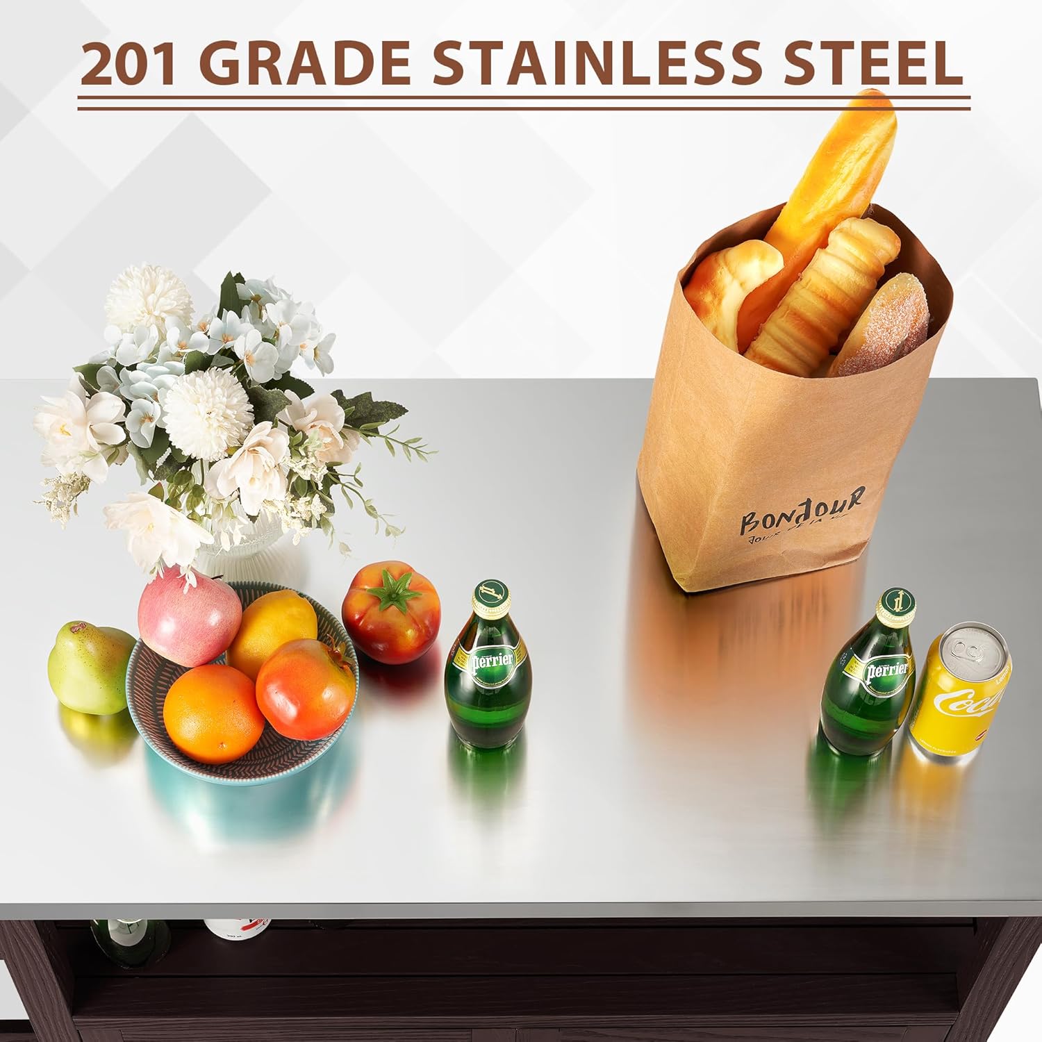 Spurgehom Outdoor Grill Table Solid Wood Storage Cabinet, Rolling Kitchen Island, Movable Bar Cart with Stainless Steel Top for Outside Patio, Backyard, Garden (Two Doors)