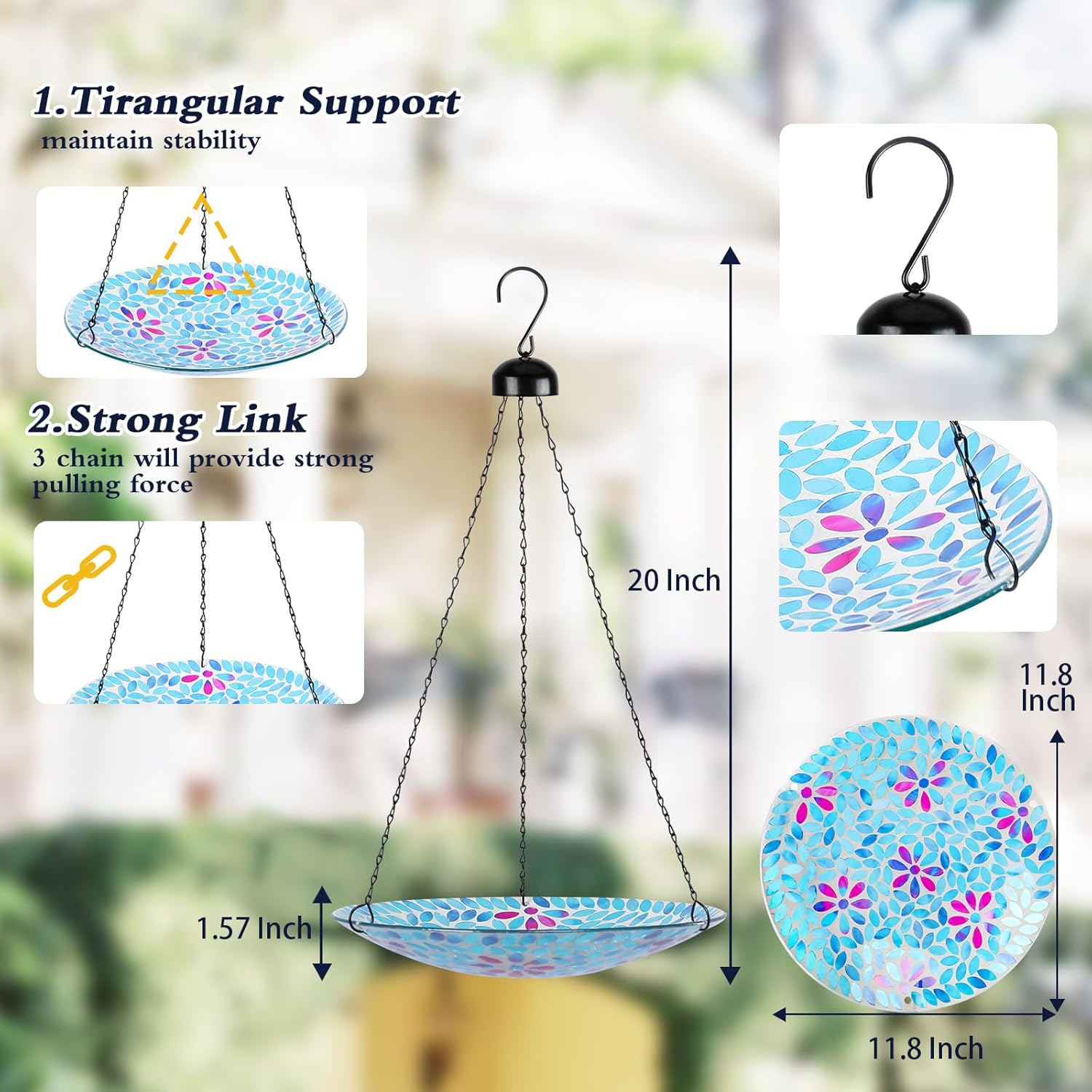 - Beautiful Mosaic Flower Bird Bath: Uses special substantial nontoxic glass, causes zero harm to birds and other creatures, and this hanging mosaic bird bath has beautiful flower pattern and distinctively bright-colored which would attract more birds to bathe