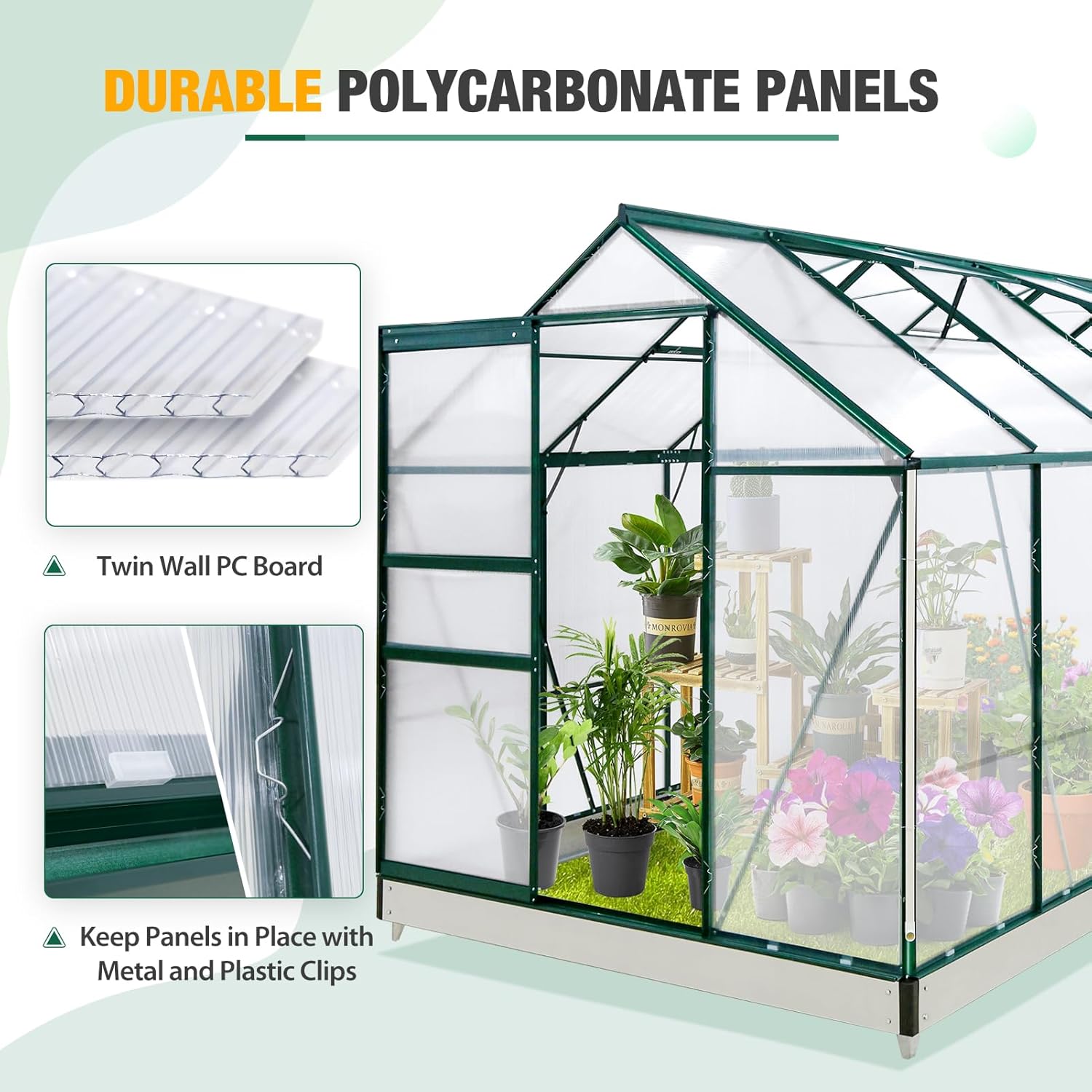 EAGLE PEAK 10x6x7 Outdoor Walk-in Hobby Greenhouse with Adjustable Roof Vent, Rain Gutter, Base and Anchor, Polycarbonate Aluminum Green House for Backyard Garden, Dark Green