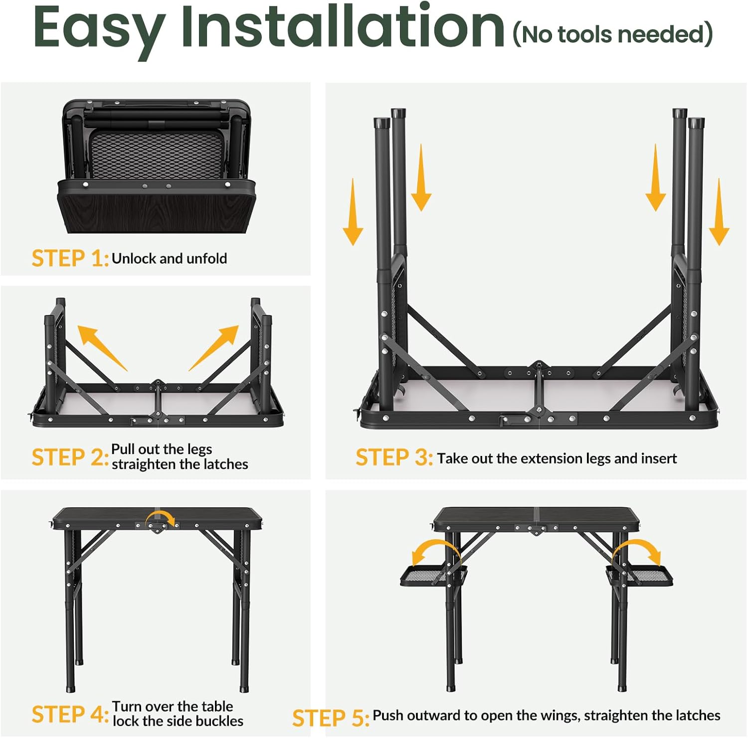 - Simple 5-step Installation (No tools needed). Step 1: Unlock and unfold. Step 2: Pull out the legs and straighten the latches. Step 3: Take out the extension legs and insert. Step 4: Turn over the table and lock the side buckles. Step 5: Push outward to open the wings, straighten the latches. Done. Please refer to the installation steps in the picture and video.