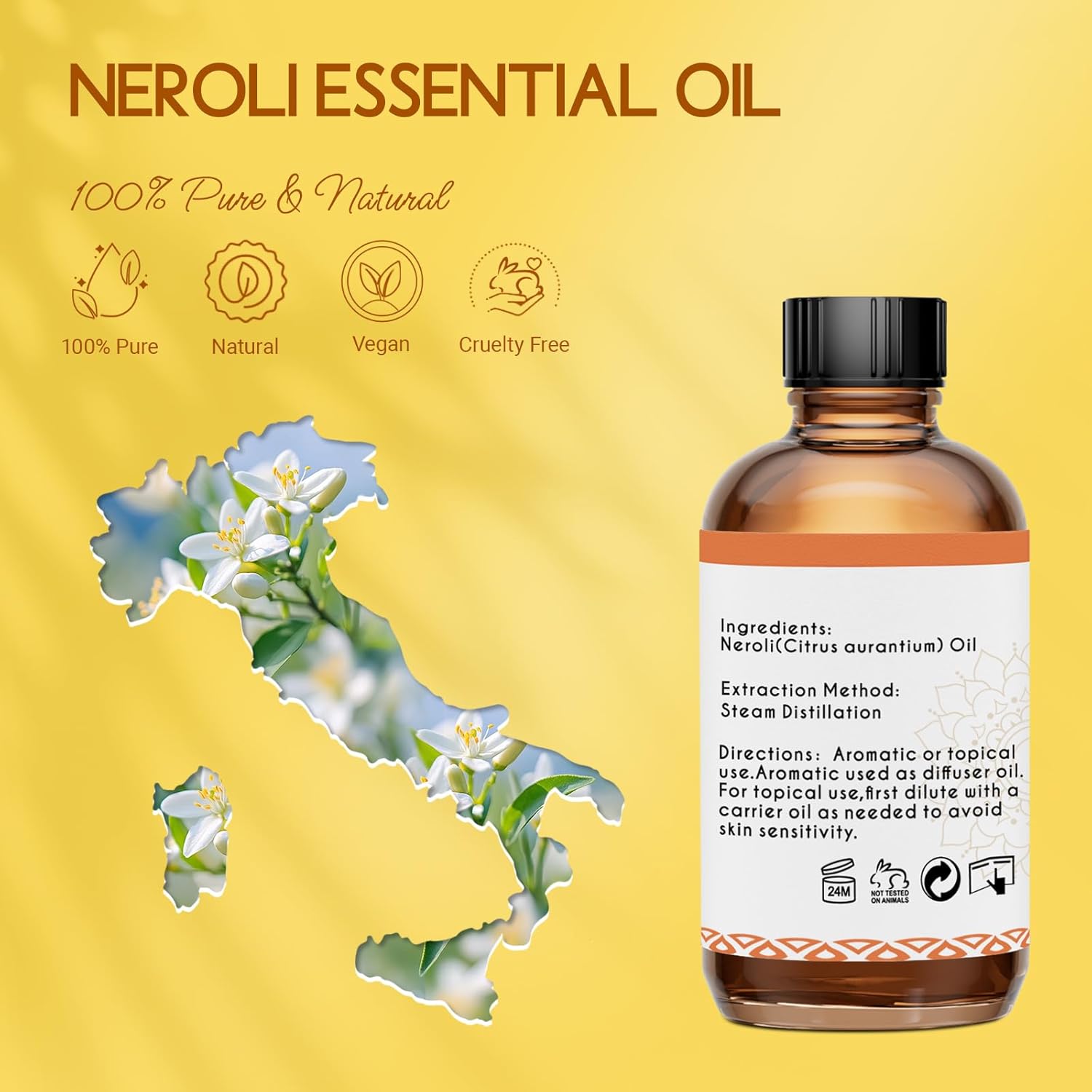 - Versatile Use: With its soothing&uplifting properties, our neroli essential oil can be used in a variety of ways.You can dilute it with carrier oils, add it to your favorite skin care products like lotion, cream, massage oil, beard oil, shampoo and more to acheive mutiple results.