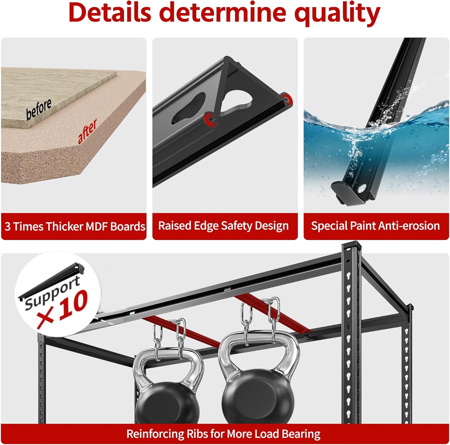 - ă3000LBS Capacity & 10 Support Ribs Garage ShelvingăGarage shelving is made of heavy duty metal. The shelving unit has 2 support rods under each layer of MDF for this storage shelves, which can further increase the load bearing to meet ur needs for placing heavy objects. The thickened single-layer load-bearing capacity 600LBS and the total load-bearing capacity of 3000LBS. It is suitable for garage, workplaces, living room, kitchen, to store camping equipment, tools, kitchen supplies