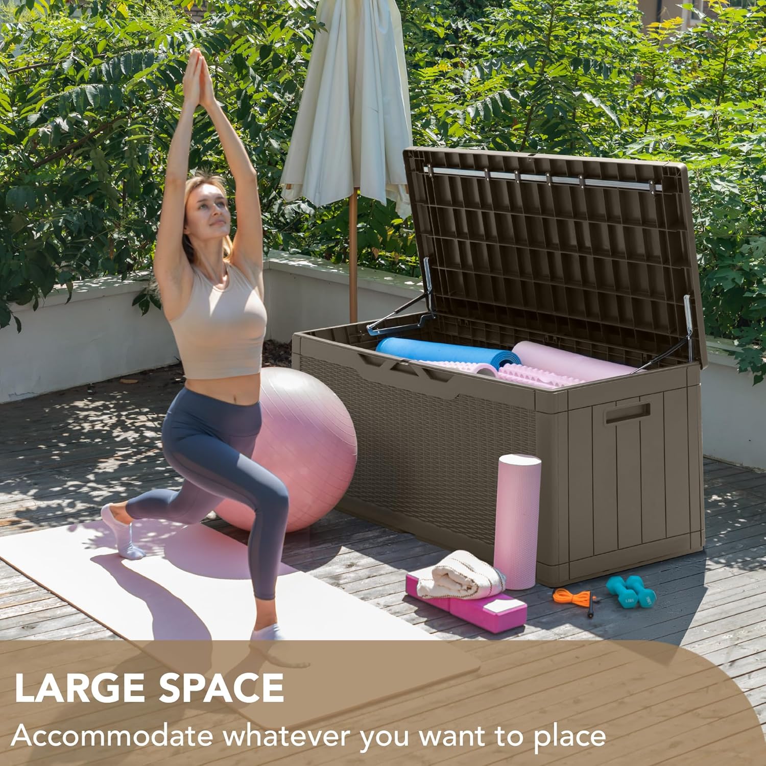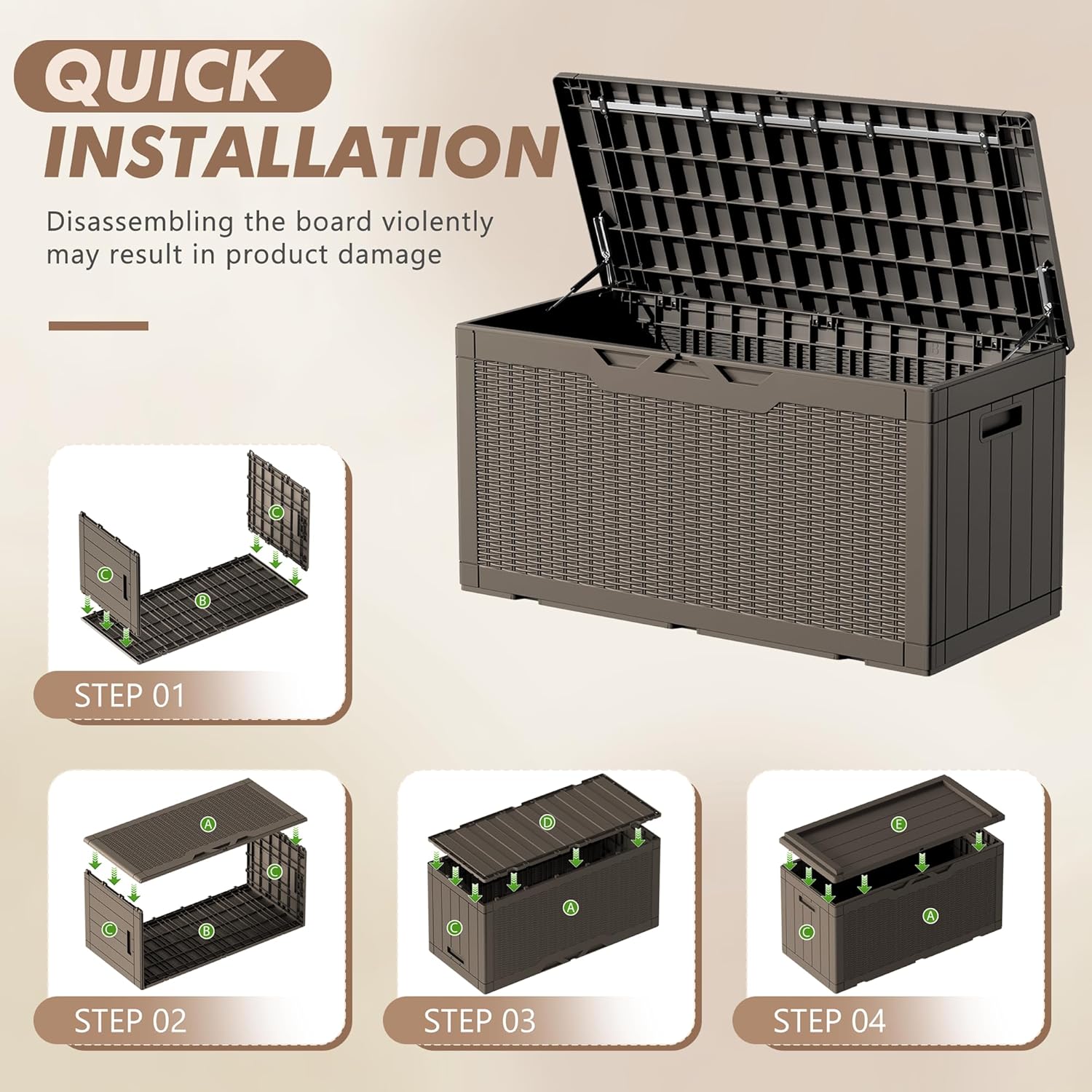 - Durable Resin Material: Deck box is made of waterproof resin, with a complementing rattan pattern design, effectively preventing fading and rusting, while also maintaining a fresh appearance even with all-weather use