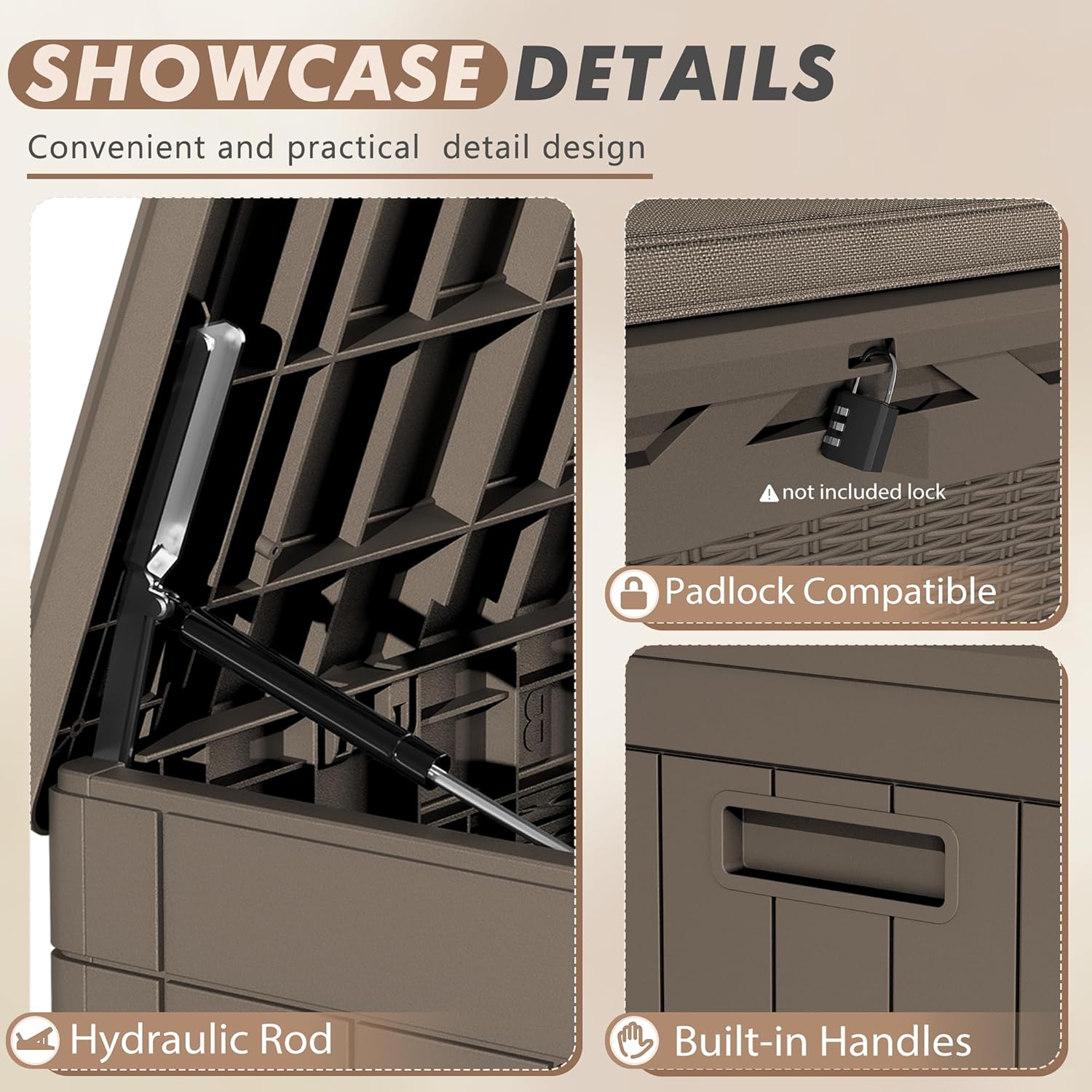 - Extra Bench Cushion: Patio storage box also includes a comfortable cushion for use as a two-person bench. Additionally, the handles on both sides allow for easy mobility, and the hydraulic gas strut design prevents pinching. It is further enhanced with a lockable lid to ensure safety