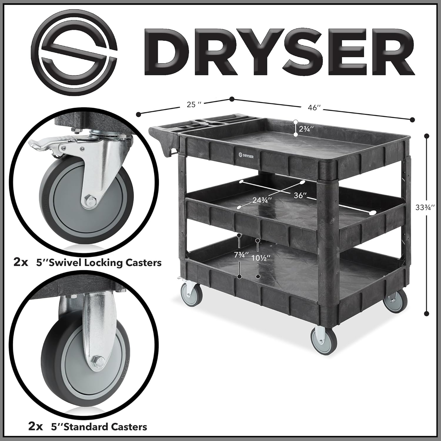 Dryser Utility Cart with Wheels, 46" x 25" Heavy Duty 550 lb. Capacity with Shelves - 3 Tier Rolling Cart with Two 5" Swivel Casters for Warehouse, Garage, Cleaning