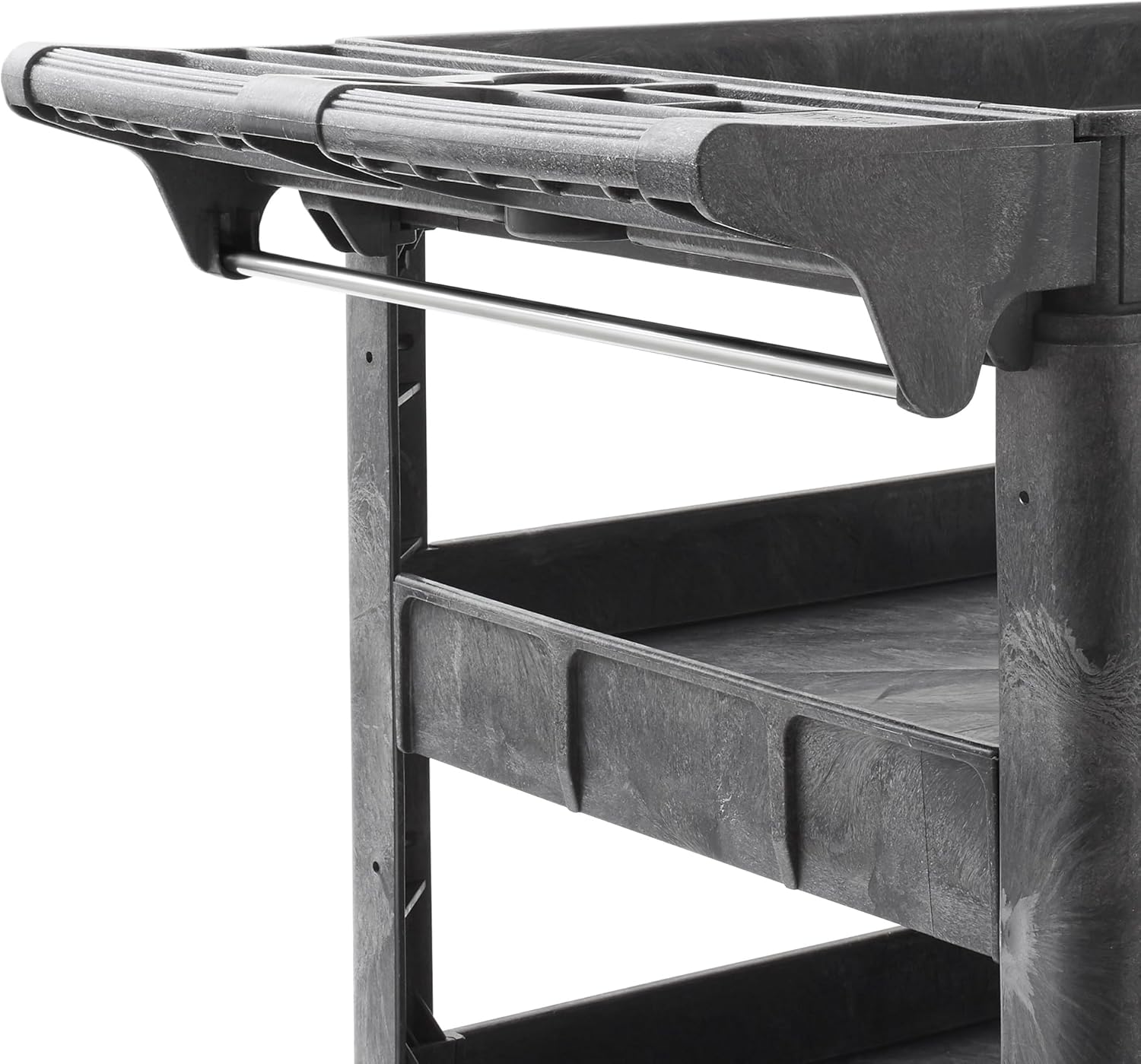 - Built-in molded handle: Beveled handle provides easy pulling, pushing, maneuvering, the cart also includes small compartments for additional tool storage, perfect for items like markers, tapes, and glues. A metal bar beneath the handle allows for hanging rags, towels, or other items. Additionally, side circular holes within the support columns allow you to attach accessories and hooks to hang small tools.