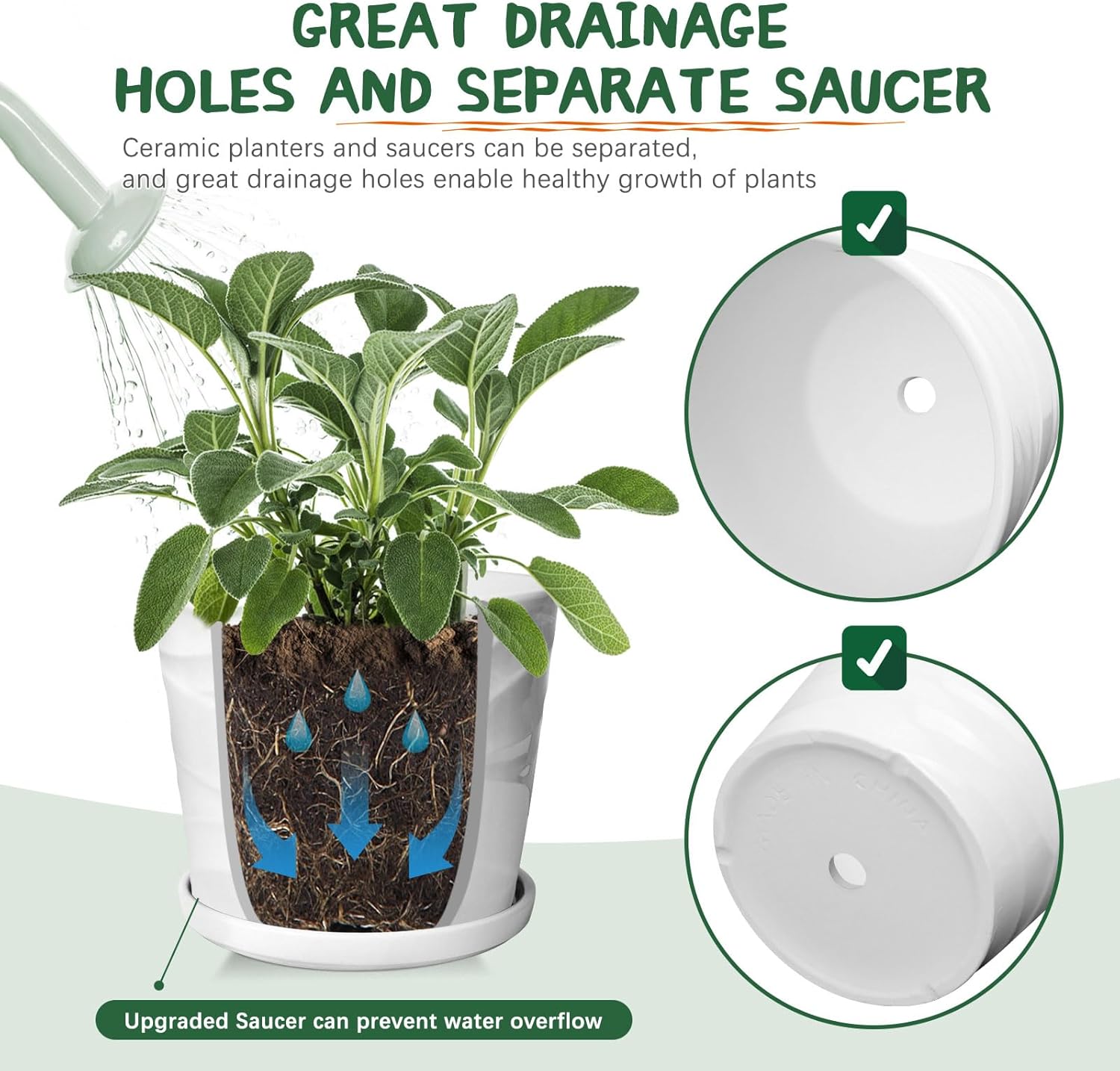 - 【With Drain Holes and Saucers 】 The drain hole in the middle of the bottom of the planter can drain out excess water, allowing the plant to grow healthier. There are saucers to catch excess mud and water so as not to stain the floor.