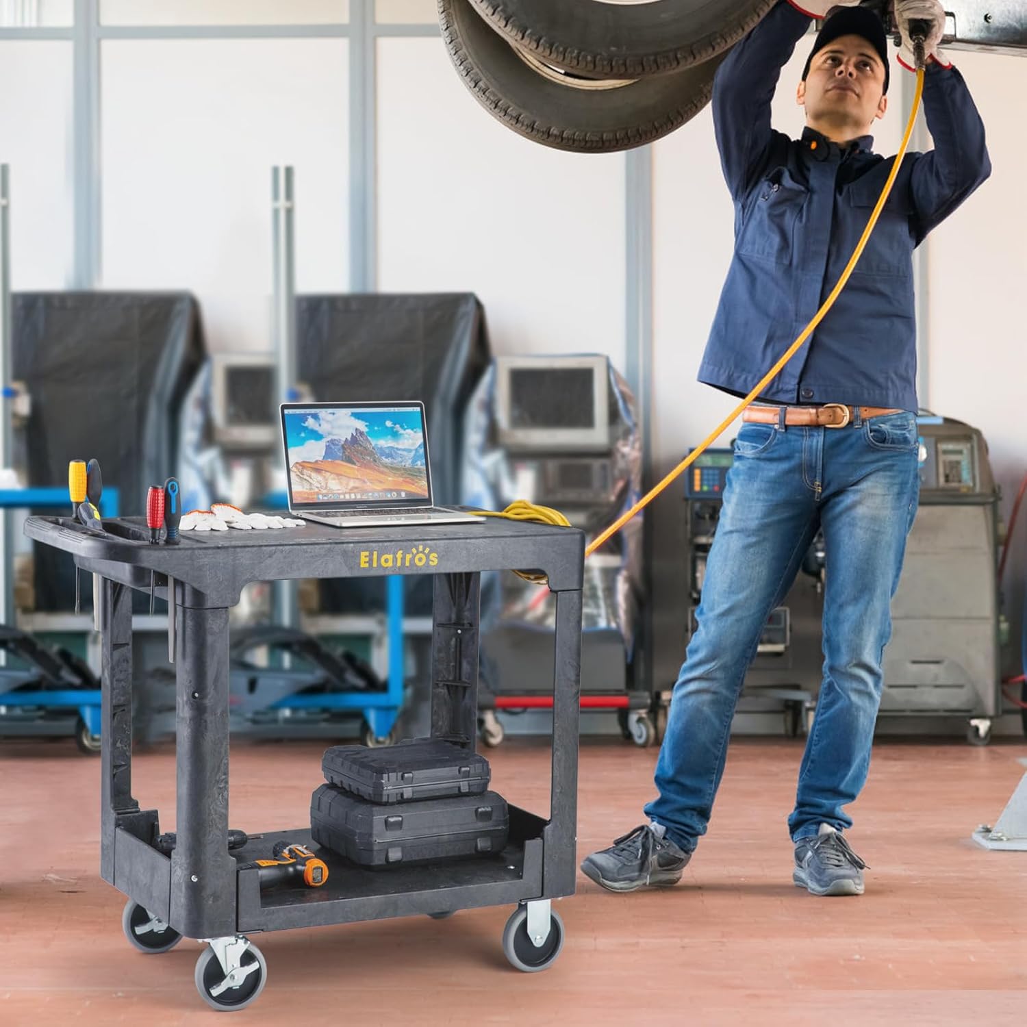 - 🔆 ERGONOMIC HANDLE AND CORD WRAP: Our service cart ergonomic push handle is molded into top shelf with a built-in storage compartment and 4 tool holders, which provides optimum hand placement and pushing height to improve control & worker safety. Molded In cord wrap allow you organize wire better.