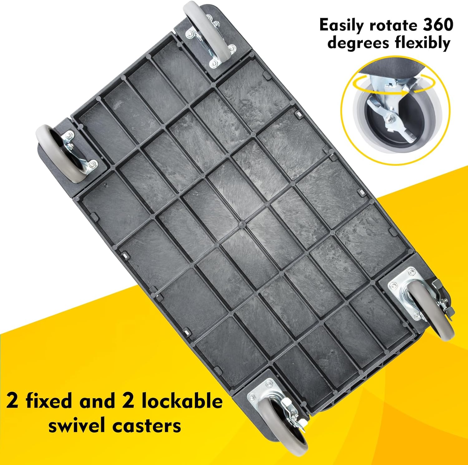 - 🔆 EASY MANEUVER & LOCKING BRAKES: Designed with two fixed and two lockable swivel wheels, offers a superior mix of stability and flexibility. The fixed wheels ensure steady straight-line movement, while the lockable swivel wheels provide agile navigation and secure positioning when needed. This combination makes it ideal for effortlessly transporting items with precision and ease, without the need for constant adjustment. Durable and floor-friendly, it's a practical solution for carrying loads efficiently in any setting.