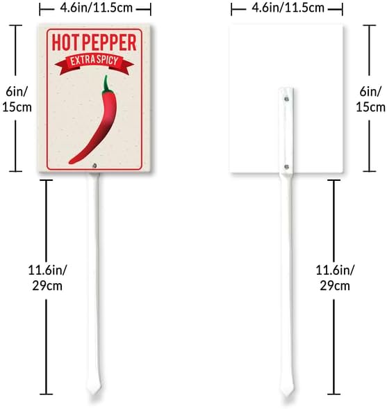 - [Extra large size] The plant tags total height 17.6", Width 4.6“ , Thickness is 0.07". The extra large size of the label makes the graphics are easy to read and attractive. Ther are thick, tall, and sturdy, and go into the ground easily