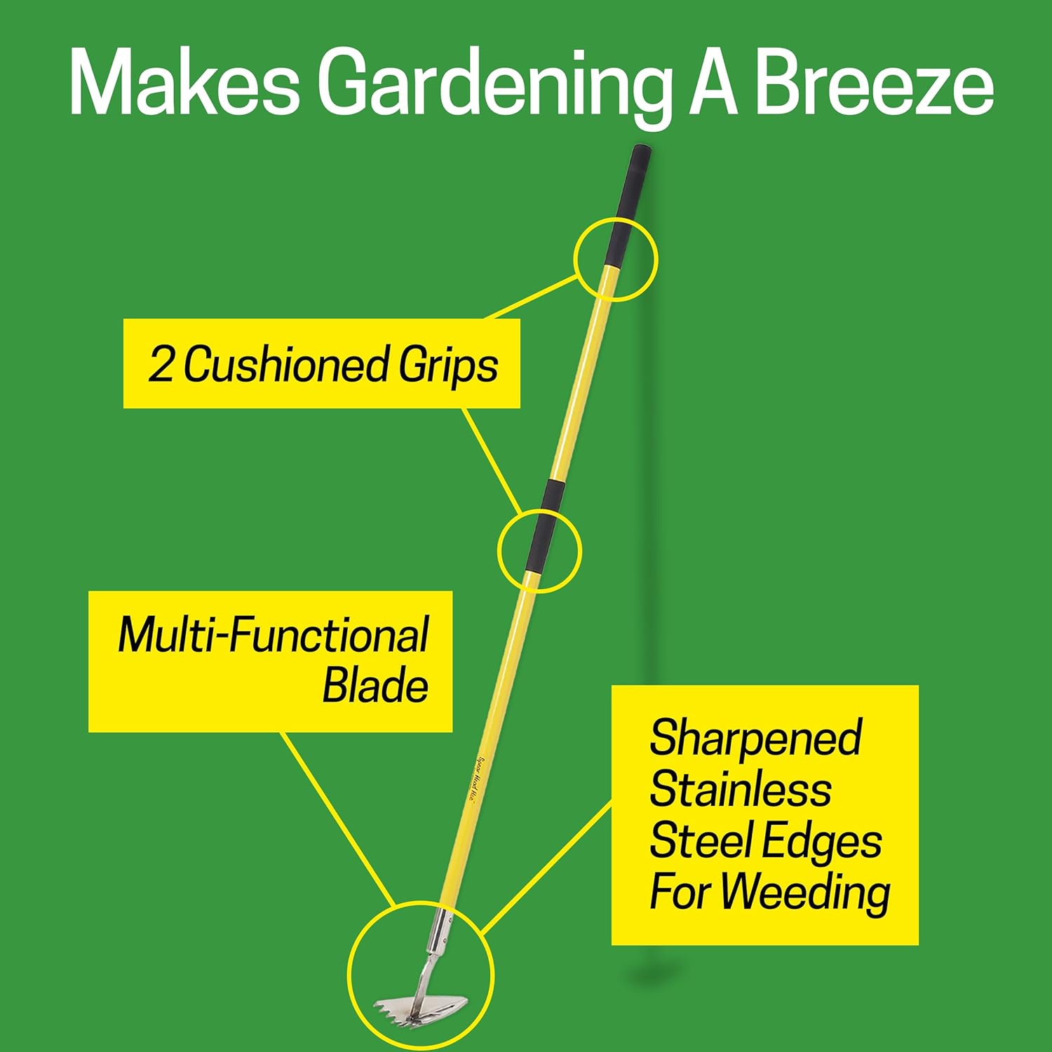- GARDEN COMFORTABLY- Our 59” long garden hoe handle lets you stand upright, eliminating back strain from bending over, making gardening a breeze. Developed with 2 cushioned grips to ensure a secure and comfortable hold so you can work longer with ease