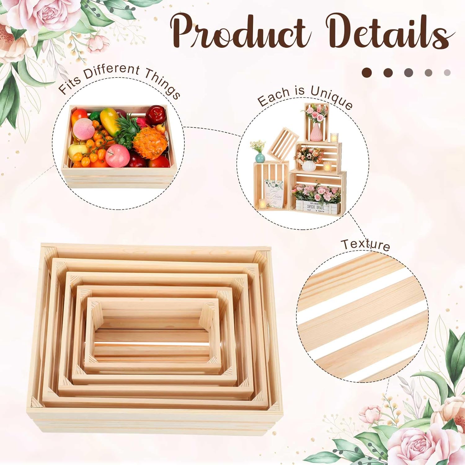 - Wide Range of Sizes: offering versatility in size, these decorative storage crates wood are designed to fit various purposes; Available in 5 different sizes, about 4.7'' x 8.5'' x 3.7'', 6.3'' x 10'' x 4.3'', 7.9'' x 11.6'' x 4.9'', 9.4'' x 13.2'' x 5.5'', 11'' x 14.8'' x 6.1'', they're nice for accommodating a myriad of decorative or storage necessities; You'll have ample options to choose from to meet your needs