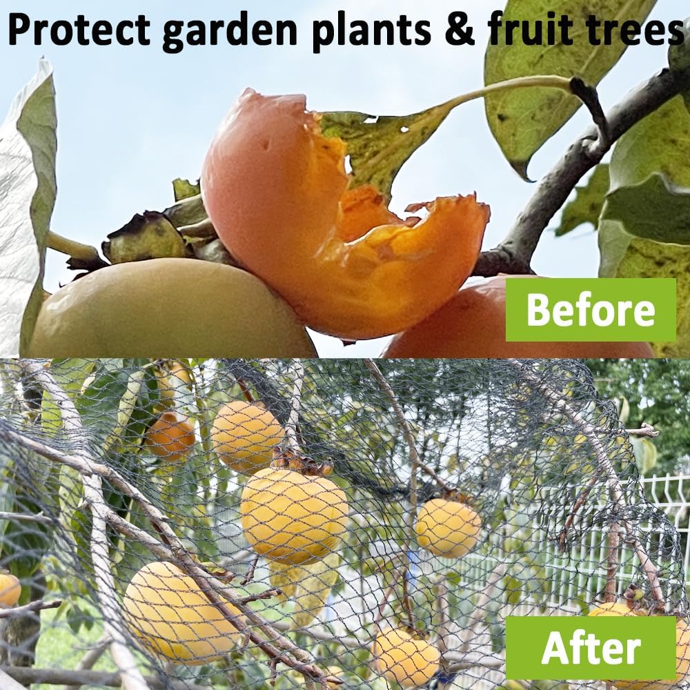 - All-Season Netting for Garden Protection: This bird netting for garden offers year-round protection for your plants, fruits, vegetables and flowers from animals such as birds, deer, squirrels, rabbits, raccoons, poultry and other animals. The tight woven mesh design creates a strong barrier without disrupting plant growth, making it perfect for safeguarding vegetable gardens, fruit trees, flower beds, shrubs, and ponds. Ideal for protecting delicate crops such as blueberries, strawberries, and cherries, this garden netting effectively keeps unwanted critters out while supporting healthy, natural growth