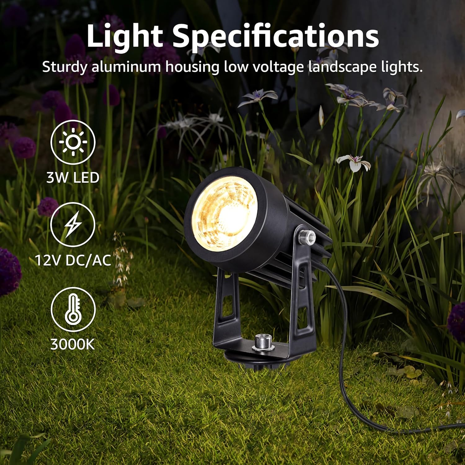 - EASY INSTALLATION - Our outdoor spot lights require no assembly. Just screw the stake on. With 16 in ETL-Listed light wire for flexible light placement. Works on 12-24V DC/AC, compatible with most transformers. The included fastlock2 wire connectors make wiring a breeze. NOTE: Transformer and low voltage wire are not included.
