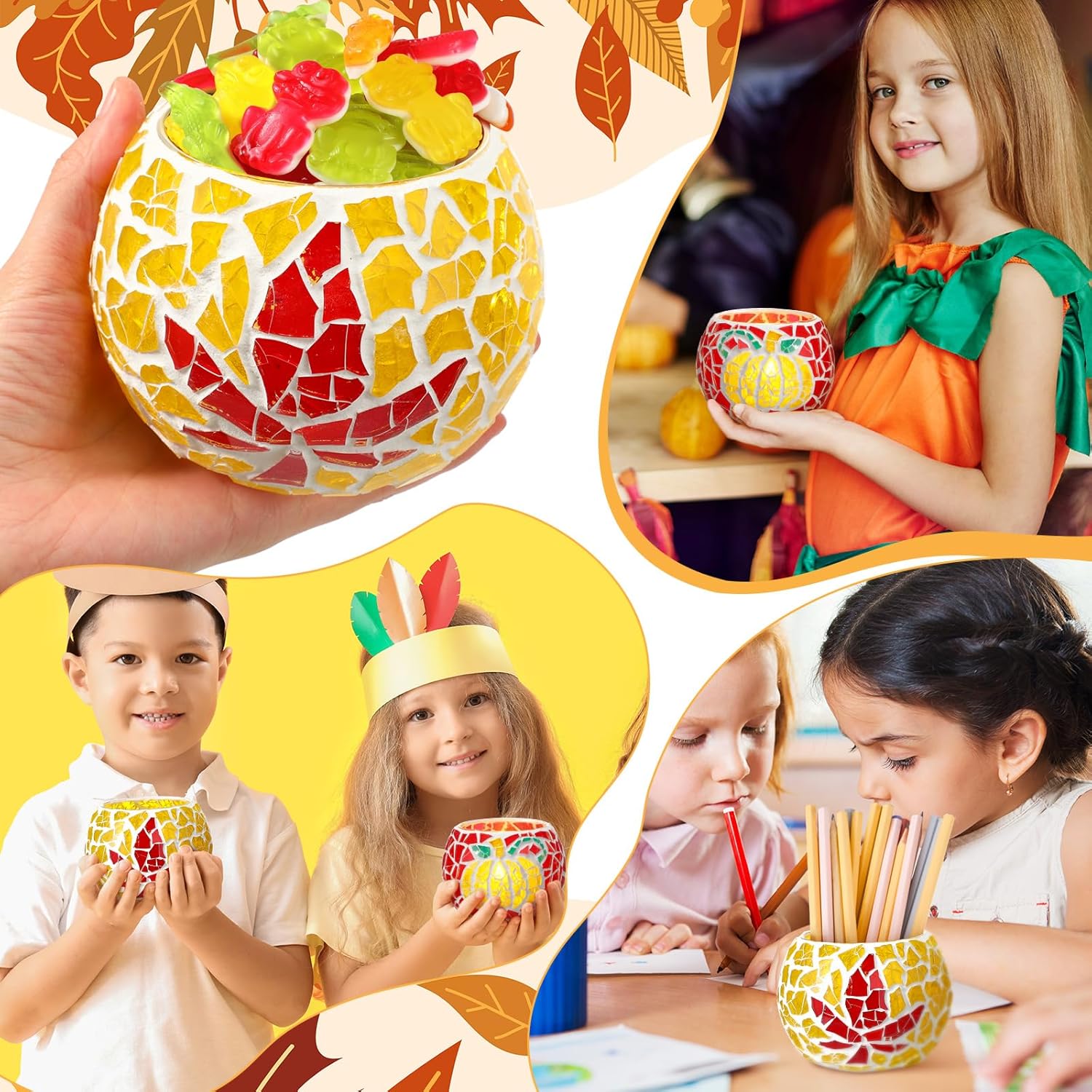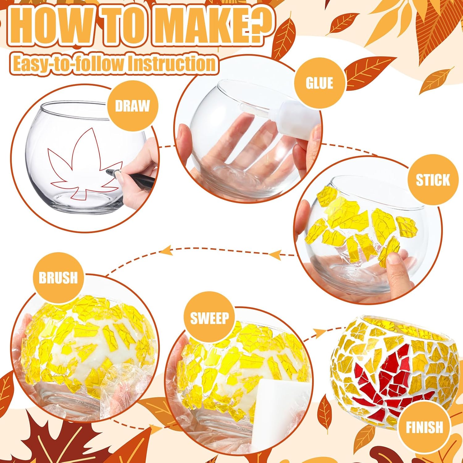 - Complete Package: the glass mosaic kit comes with 2 sets providing double the creativity opportunities, fall candle holder includes glass jar, candle, mosaics, cream glue, cleaning sponge, crystal caulk and Instruction manual; These mosaic art kit give you all the tools needed to create elegant, unique candle holders; It's a comprehensive package for anyone with a creative inclination