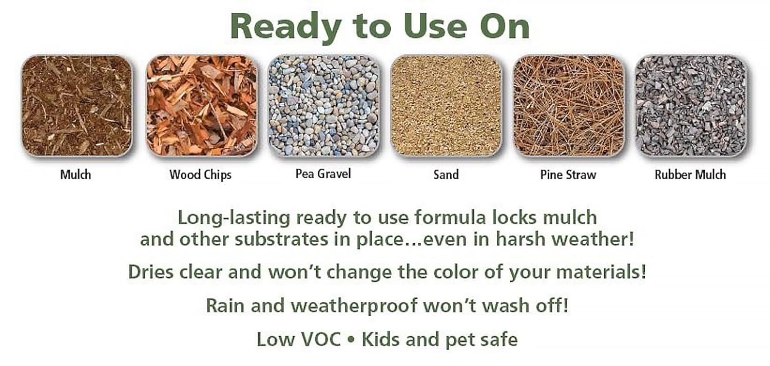 - Long-Lasting Landscape Glue: Locks mulch in place up to 2 seasons; Withstands harsh weather conditions; Prevents wash-outs and wind displacement of mulch; Maintains landscape aesthetics throughout the seasons