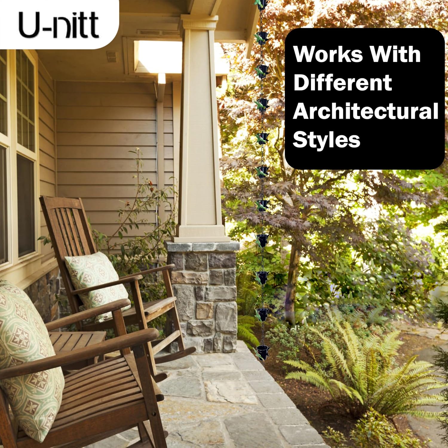 - ENHANCE YOUR HOME'S AESTHETIC - with this stunning U-nitt rain chain that transforms rainwater into a mesmerizing outdoor waterfall. This elegant alternative to traditional downspouts creates a tranquil fountain-like effect, adding charm to your garden or entryway. The soothing sound of cascading rainfall enhances your outdoor ambiance, while its functional beauty integrates seamlessly with your rainwater collection system, boosting curb appeal with a unique and stylish touch.
