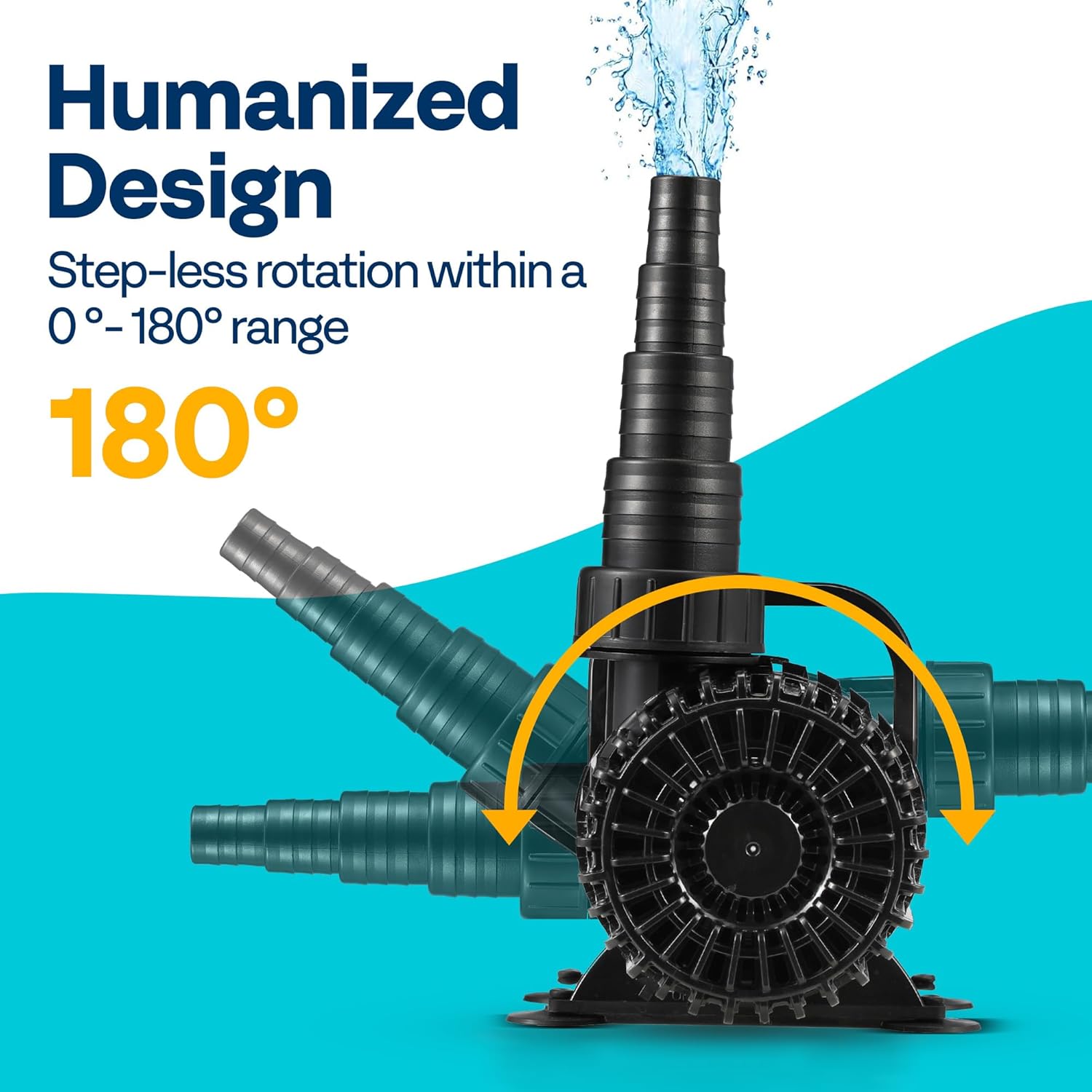 - HUMANIZED DESIGN: The nozzle can be step-less rotated within a 180-degree range to meet specific needs; 4 rubber suction cups effectively reduce resonance noise, maintaining a low running noise level of 30-40 dB; The fountain pump also incorporates overload protection, automatically shutting down at a motor temperature of 221°F to enhance safety during use
