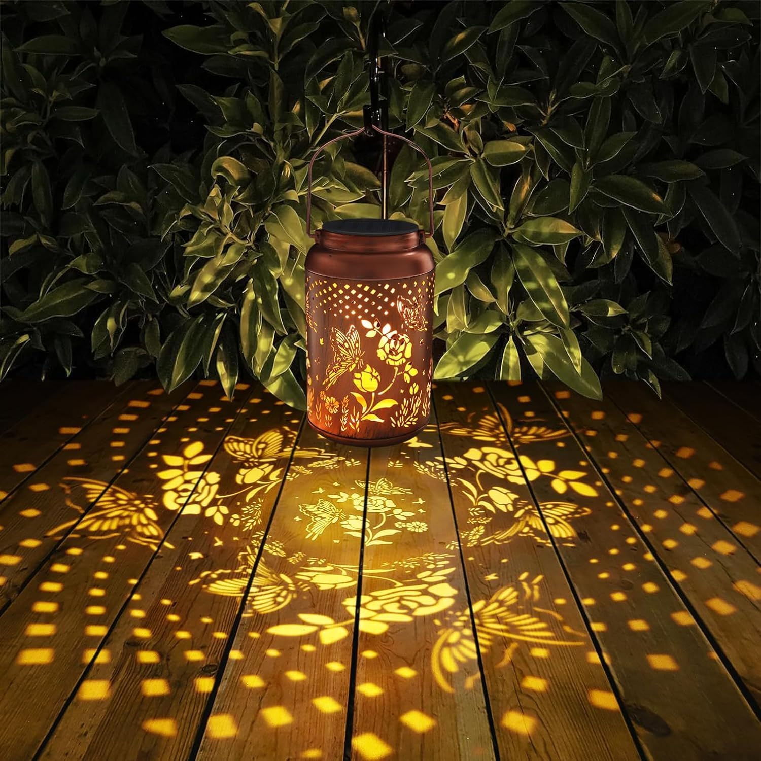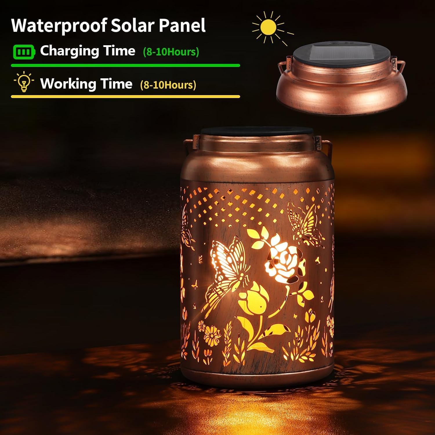 - Graceful Decorative Design:The retro appearance, with gold copper color and hollow out metal veneer, the solar outdoor lanterns casts bright and warm light in darkness, accompanied by gorgeous and graceful butterfly rose patterns, adding a beautiful atmosphere to the surrounding environment.