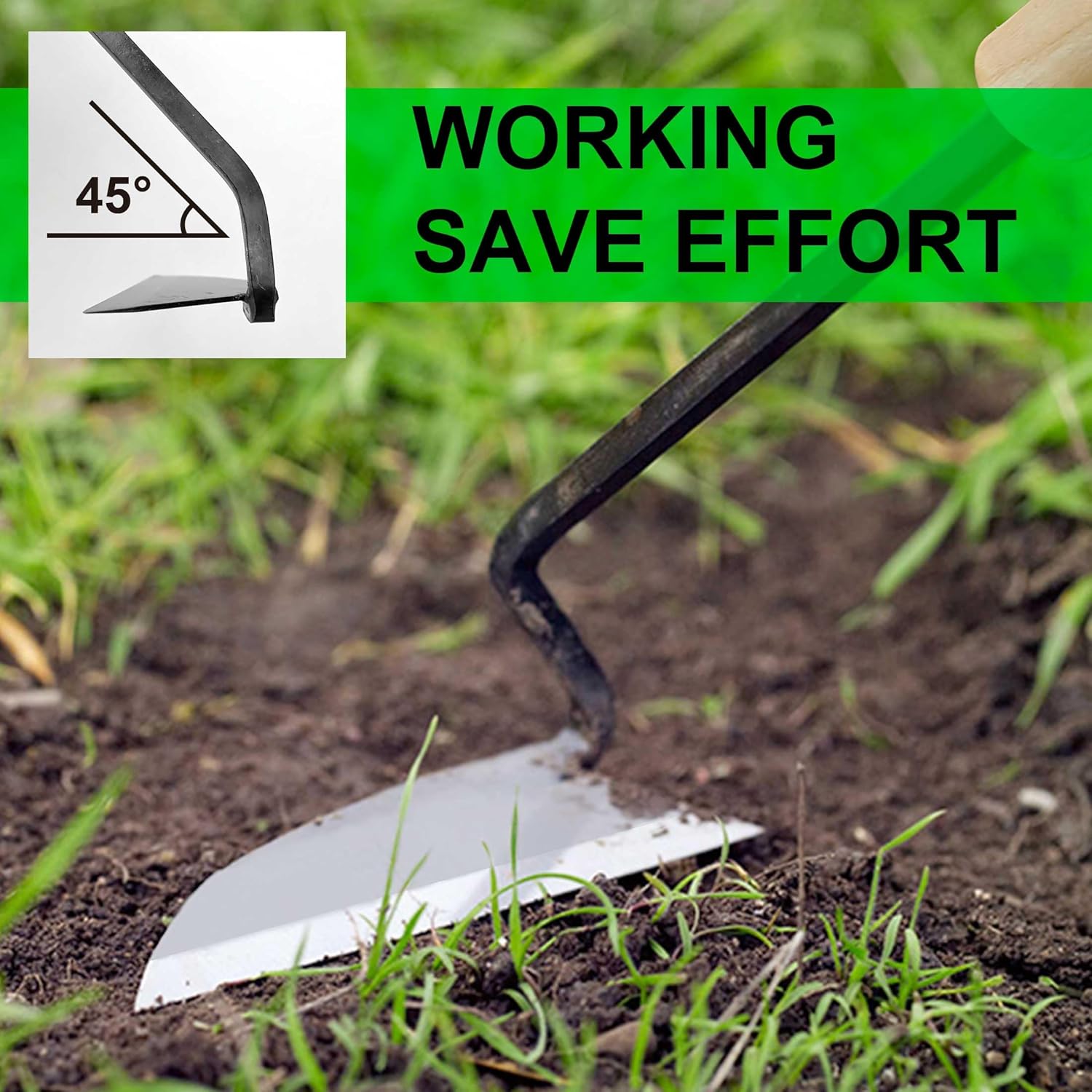 - 【Good for weeds】The elbow design makes it easy for the hoe to dig with a flat blade or dig with a pointed tip. Perfect to clear an area with not alot of room to work with. The weeder-scraper-hoe are great for weeding, allows you to effectively weed without harming vegetables and flowers