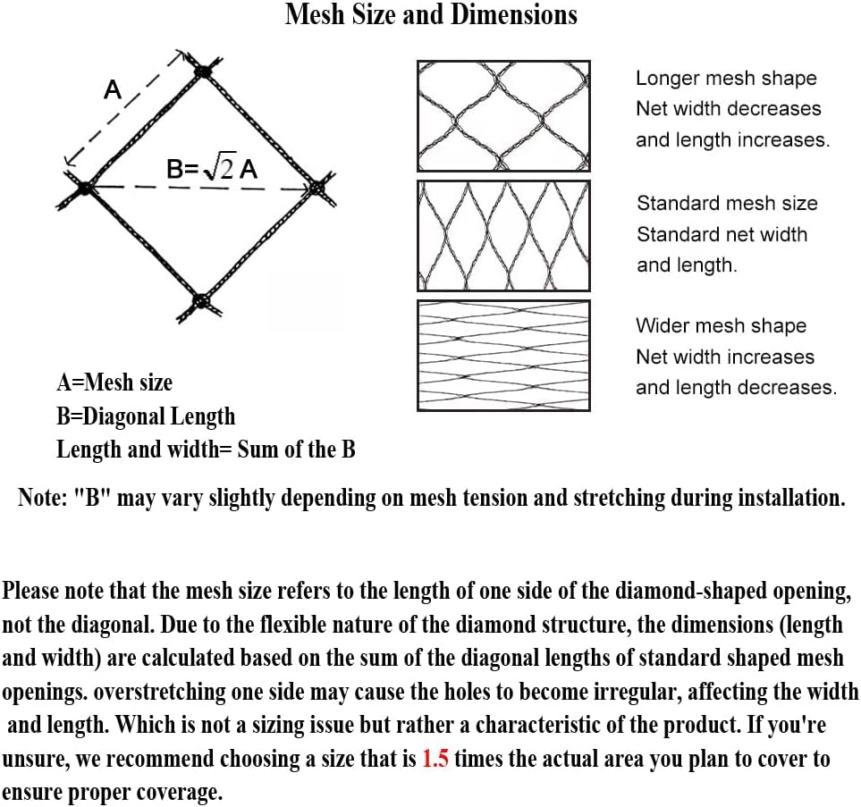 - Notice: The bird netting roll is easy to cut and shape as needed for your garden, orchard, farmland or poultry fencing. The product size refers to the dimensions when the bird netting is evenly stretched. Since the mesh is diamond-shaped, overstretching one side may cause the holes to become irregular, affecting the width and length. which is not a sizing issue but rather a characteristic of the product. Please adjust according to your needs.