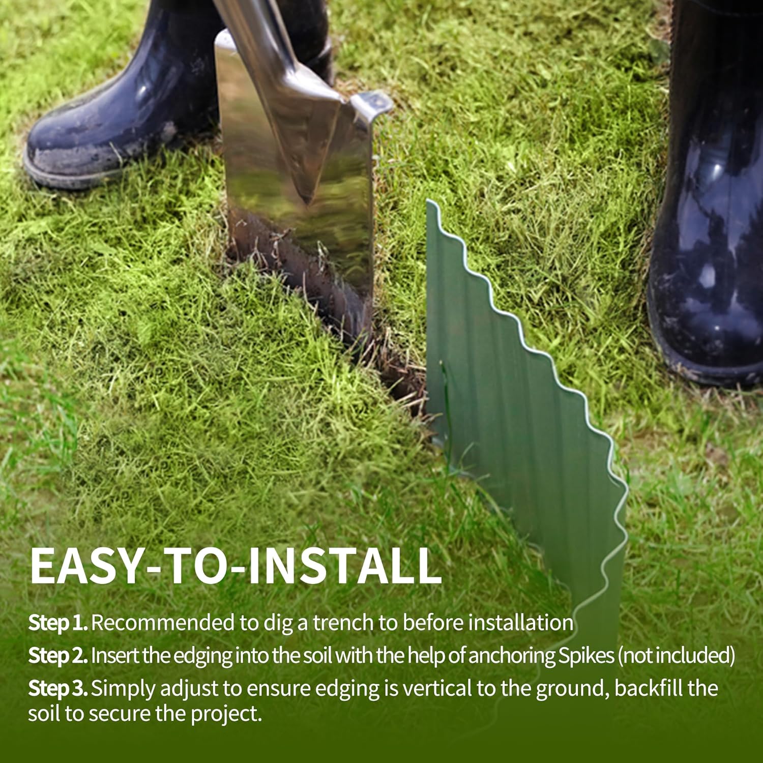 - INSTALLATION: Quick and easy to instal. 1.Wet your soil for easier installation. Push edging into the ground by hand tap with rubber mallet. 2.For hard and rocky soil, dig out a narrow, deep trench and insert the landscaping edging into the soil, then back fill the edging. (These steel edging can be cut with metal scissors. Wear your cut resistant gloves for safer installation)