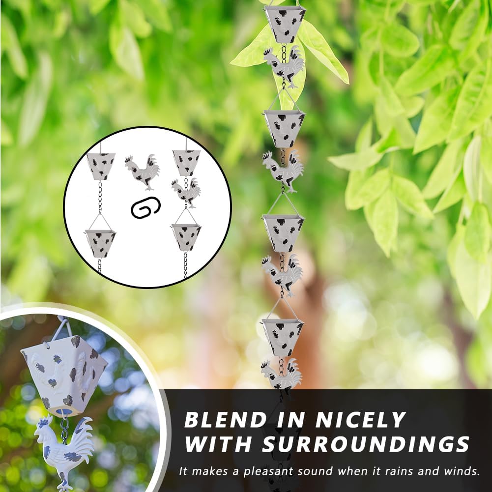 - Unique Design: The rain chain consists of 10 handmade trapezoidal cups and rooster decorations, connected by a metal chain in the middle. Hanging under the eaves, it effectively guides rainwater and decorate the house, brings excellent visual effects, making the house more elegant and beautiful. It can be used as an optional alternative to the traditional rain gutter system