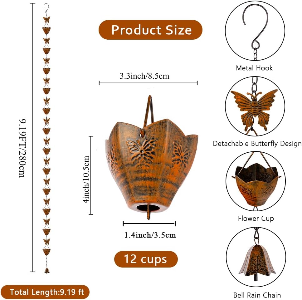 9.2FT Rain Chain for Outside, Rain Chain with 12 Butterfly Cups Adjustable Rain Chains for Gutters, Eaves, Drainage, Replacement for Downpout