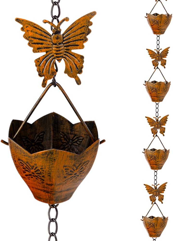 - Unique Design: The rain chain consists of 12 handmade lotus cups and butterfly decorations, connected by a metal chain in the middle. Hanging under the eaves, it effectively guides rainwater and decorate the house, brings excellent visual effects, making the house more elegant and beautiful. It can be used as an optional alternative to the traditional rain gutter system