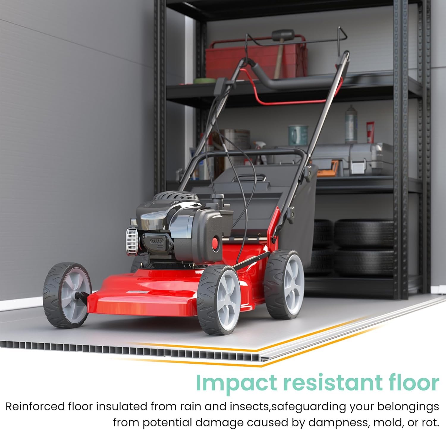 - RESIN MATERIAL:Our storage shed is crafted with 12 MM premium polypropylene resin plastic, which is recyclable. Resin shed is corrosion-resistant, waterproof, rustproof and with UV protection for more than 8000 hours, less bending and puncturing, worry-free for use in all weather conditions. It can be used daily for five years without fading
