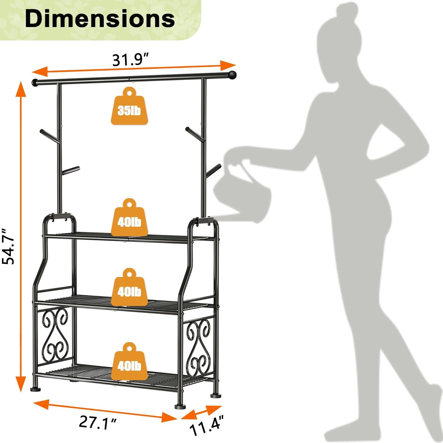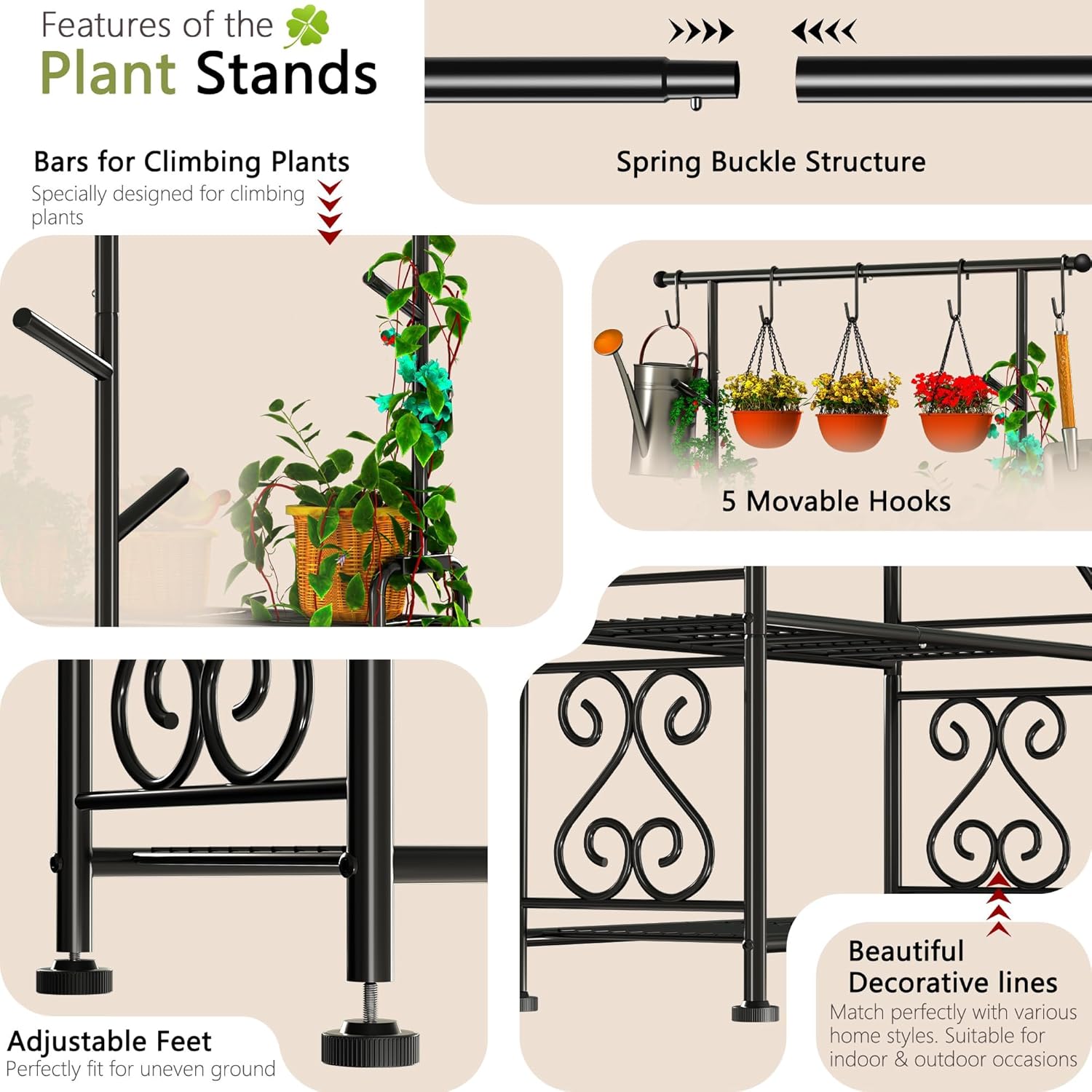 - 【🌿 Multi-Functional Plant Display】Showcase 14+ plants across 3 spacious tiers (27.1" x 11.4"W per tier). Side guardrails prevent pot slippage + 5 integrated hooks for hanging plants/tools. Ideal for climbing plants with vertical pole design.
